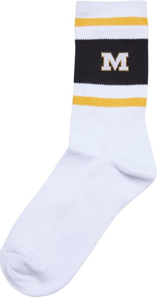 Super sportlich sind diese College Strümpfe mit eingewirkten Buchstaben auf einem wadenhohen, gerippten Schaft, welcher von mehreren Blockstreifen im Colorblock-Style eingerahmt wird. Sie sind in vier Größen erhältlich. Tragekomfort bringen das bewährte Material aus Baumwolle, Polyester und Elasthan sowie schmale, elastische Bündchen.