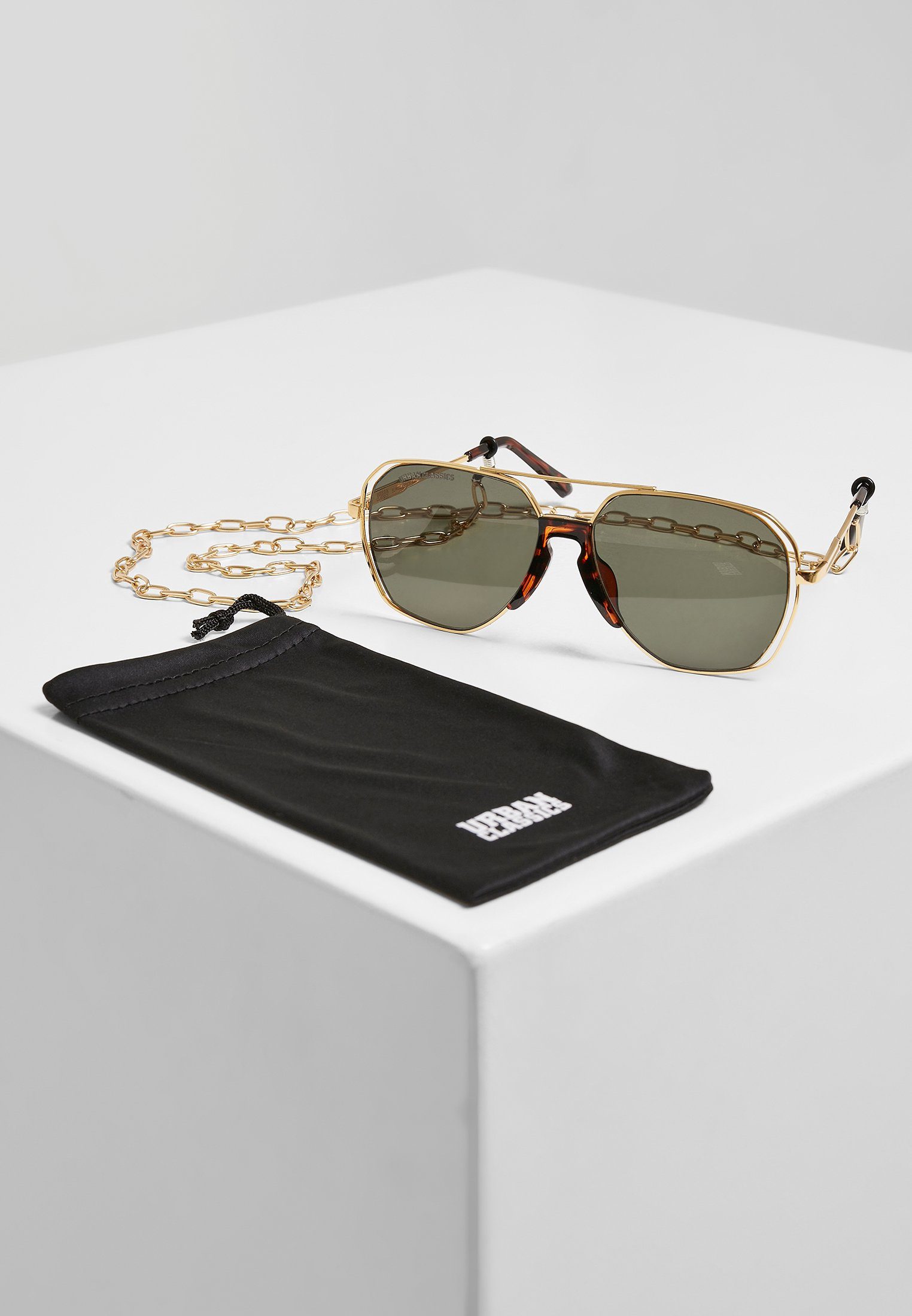 Die markante Sonnenbrille kommt passend mit einer Ankerkette daher. Das Design wird von einer kantigen, mehrteiligen Fassung sowie einer geraden Augenbrauenpartie und einem doppelten Nasensteg definiert. Schmale, gerade Bügel mit gummierten Enden runden den Style unaufgeregt ab. Bewährter UV 400 Schutz für die Augen bieten die Gläser der Urban Classics Brille mit der Filterkategorie 3. Der Rahmen besteht aus rostfreiem Stahl, Polycarbonat und Kupfer.