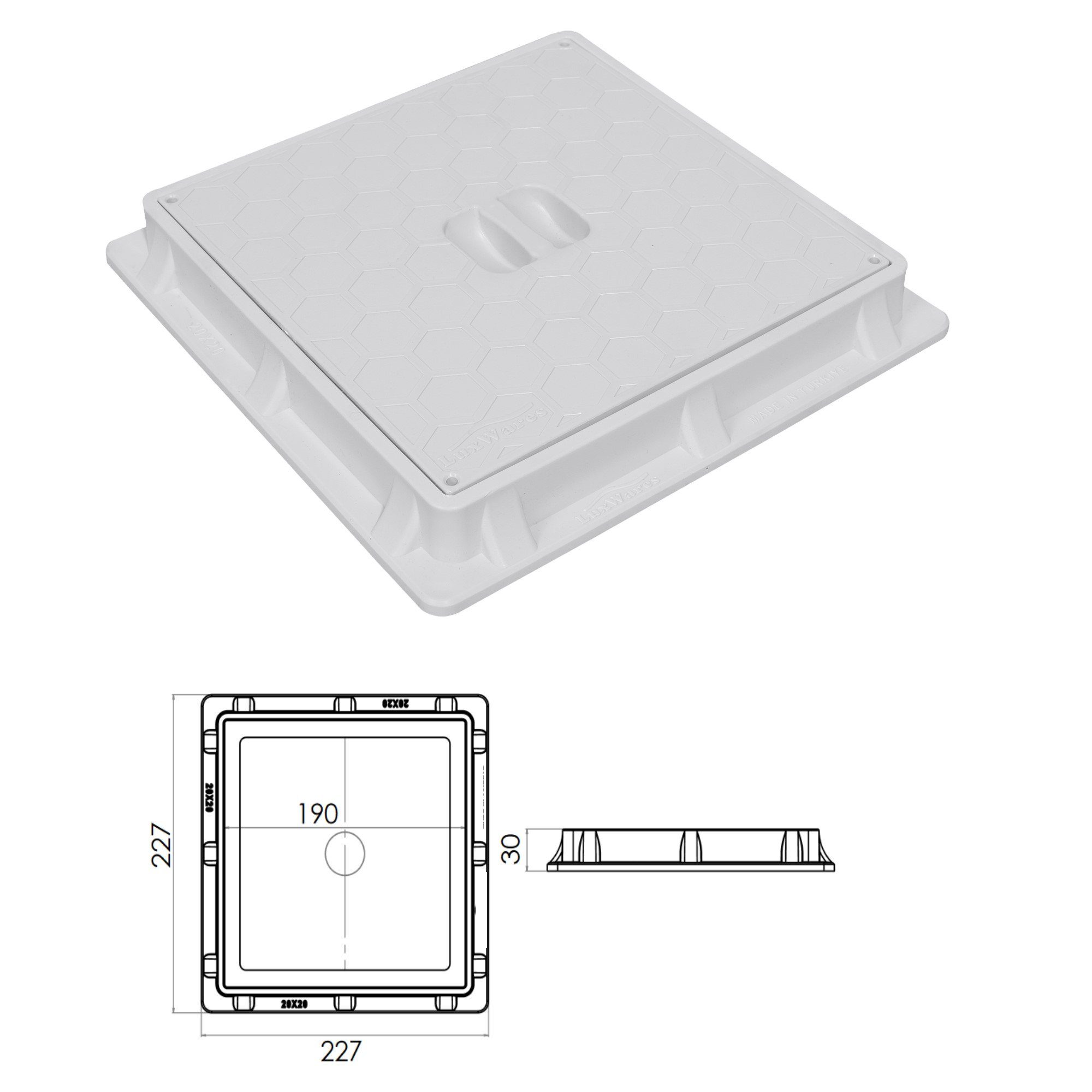 Die ideal Lösung für die sichere und zuverlässige Abdeckung von Schächten und Öffnungen in Gehwegen, Straßen und anderen öffentlichen Bereichen. Lieferumfang: Abdeckplatte mit Rahmen Technische Daten: Schachtabdeckung 20x20cm mit Rahmen Tragkraft 4,5kN/450kg Gewicht 520gr. Schachtabdeckung 22,5x22,5cm mit Rahmen Tragkraft 5kN/500kg Gewicht 640gr. Schachtabdeckung 30x30cm mit Rahmen Tragkraft 8kN/800Kg Gewicht: 1300gr. Schachtabdeckung 32,5x32,5cm mit Rahmen Tragkraft 8,4kN/840kg Gewicht 1500gr. Schachtabdeckung 35x35cm mit Rahmen Tragkraft 9kN/0,9t. Gewicht: 2000gr. Schachtabdeckung 40x40cm mit Rahmen Tragkraft 10kN/1t. Gewicht: 2575gr. Schachtabdeckung 50x50cm mit Rahmen Belastungsklasse A 15 (Begehbar) Tragkraft 14,7kN / 1,4t. Gewicht: 4160gr Schachtabdeckung 55x55cm mit Rahmen Belastungsklasse A 15 (Begehbar) Tragkraft 17kN / 1,7t. Gewicht 7100gr. Schachtabdeckung 70x70cm mit Rahmen Belastungsklasse A 15 (Begehbar) Tragkraft 30kN / 3t. Gewicht 13kg. Schachtabdeckung 60x30cm mit Rahmen Belastungsklasse A 15 (Begehbar) Tragkraft 8,5kN / 866.7 Kg Gewicht 3kg.