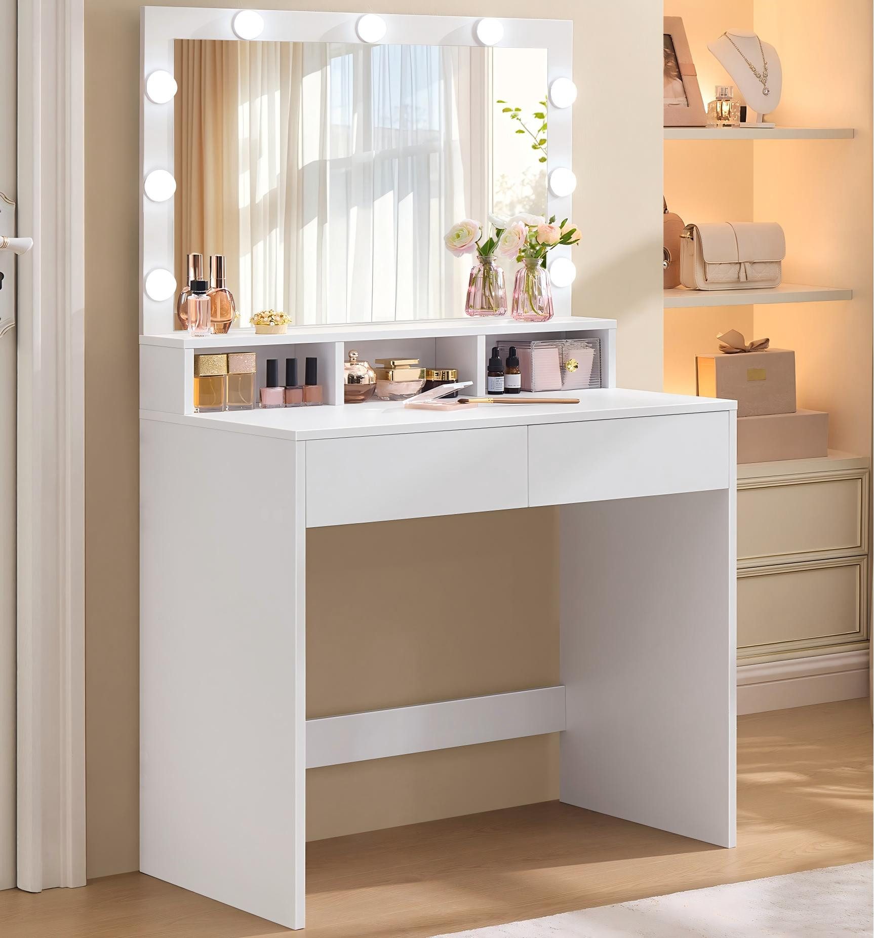 Ausstattung | mit 9 LED-Glühbirnen 2 Schubladen 3 offene Fächer Spiegel |