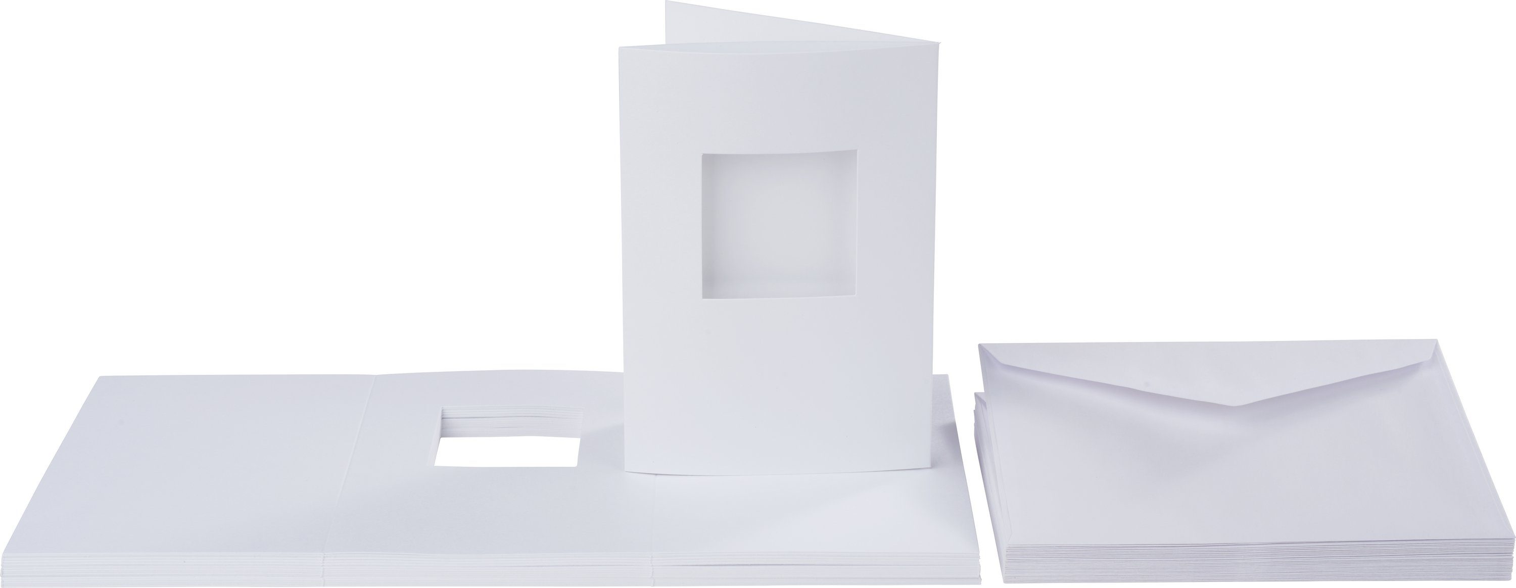 30 weiße Passepartoutkarten mit quadratischem Ausschnitt mit einer Розмір von ca. 5 x 5 cm. Die Karten haben das Format DIN A6 (ca. 10,5 x 15 cm) und sind jeweils mit einem Gegenblatt versehen, inkl. 30 passenden Umschlägen. Sie können die Karten einfärben, bekleben, beschriften und vieles mehr. Hinterlegen Sie das Passepartout mit bemustertem Transparentpapier oder kleben, stempeln oder malen Sie niedliche Motive in den Ausschnitt. 3D-Motive sehen in den Passepartoutrahmen besonders edel aus.