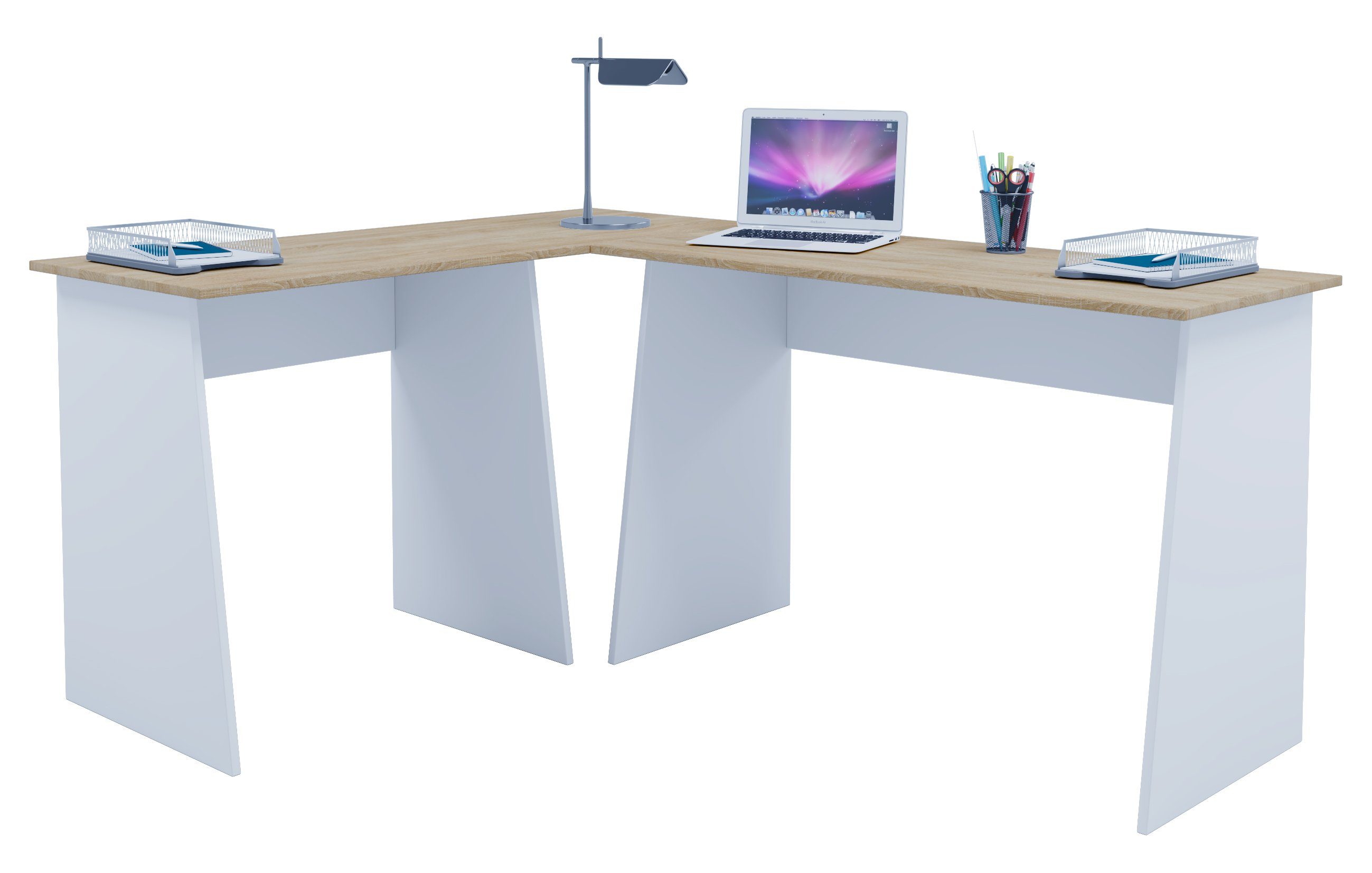 Der Schreibtisch ist sehr instabil. Die Eckplatte benötigt einen zusätzlichen Fuß. Ich habe immer das Gefühl, dass es gleich abbricht. Die Tiefe für den ganzen Schreibtisch ist doch ein wenig zu klein.