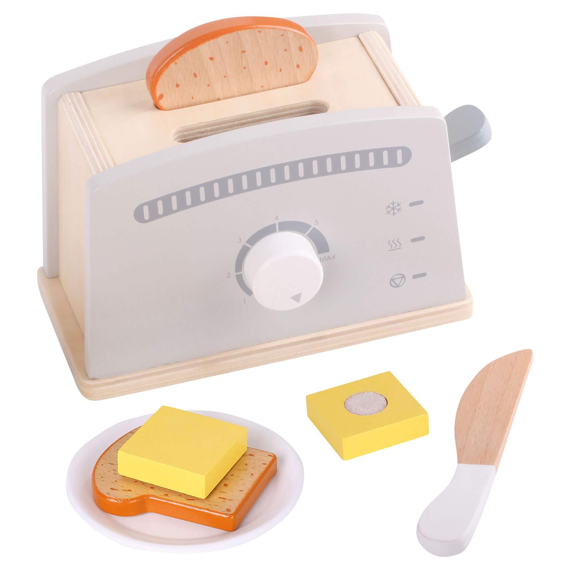 Entdecke den Beeboo Kitchen Holz Toaster mit Zubehör für Kinder. Das Spielerlebnis für kleine Meisterköche! Dieses liebevoll gestaltete Set bringt Spaß und Kreativität in jede Spielküche. Mit dem authentischen, aus Holz gefertigten Toaster können Kinder ihre eigenen Frühstücksrituale nachspielen. Einfach die zwei enthaltenen Brotscheiben einlegen und mit dem Hebel herausspringen lassen. Dazu gibt es zwei realistische Butterstücke, die perfekt auf das Toastbrot passen. Serviere alles auf dem beigefügten Teller und nutze das kindgerechte Messer für unbeschwertes Spielvergnügen.