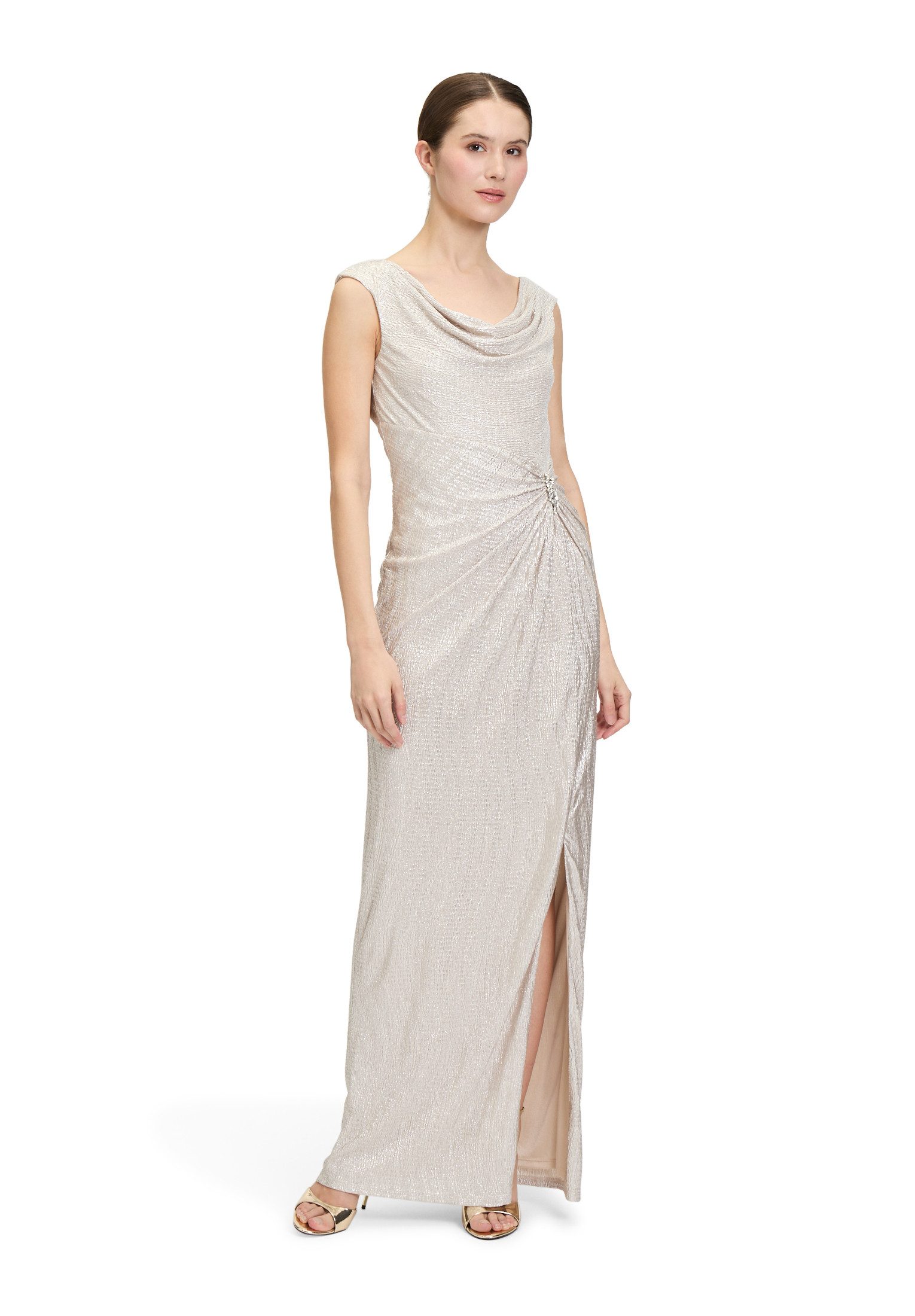 Ein absoluter Hingucker! Dieses Abendkleid vereint elegante Details und eine figurschmeichelnde Silhouette. Der edle Jersey-Stoff und die feine Raffung betonen weibliche Konturen und sorgen für eine stilvolle Ausstrahlung. Ein glamouröser Wasserfallausschitt und ein seitlicher Schlitz verleihen dem Kleid eine besondere Note, während die zierende Brosche einen Hauch von Raffinesse hinzufügt. Ärmellos und mit einem Reißverschluss im Rücken, ist es ideal für elegante Anlässe und zieht alle Blicke auf sich.