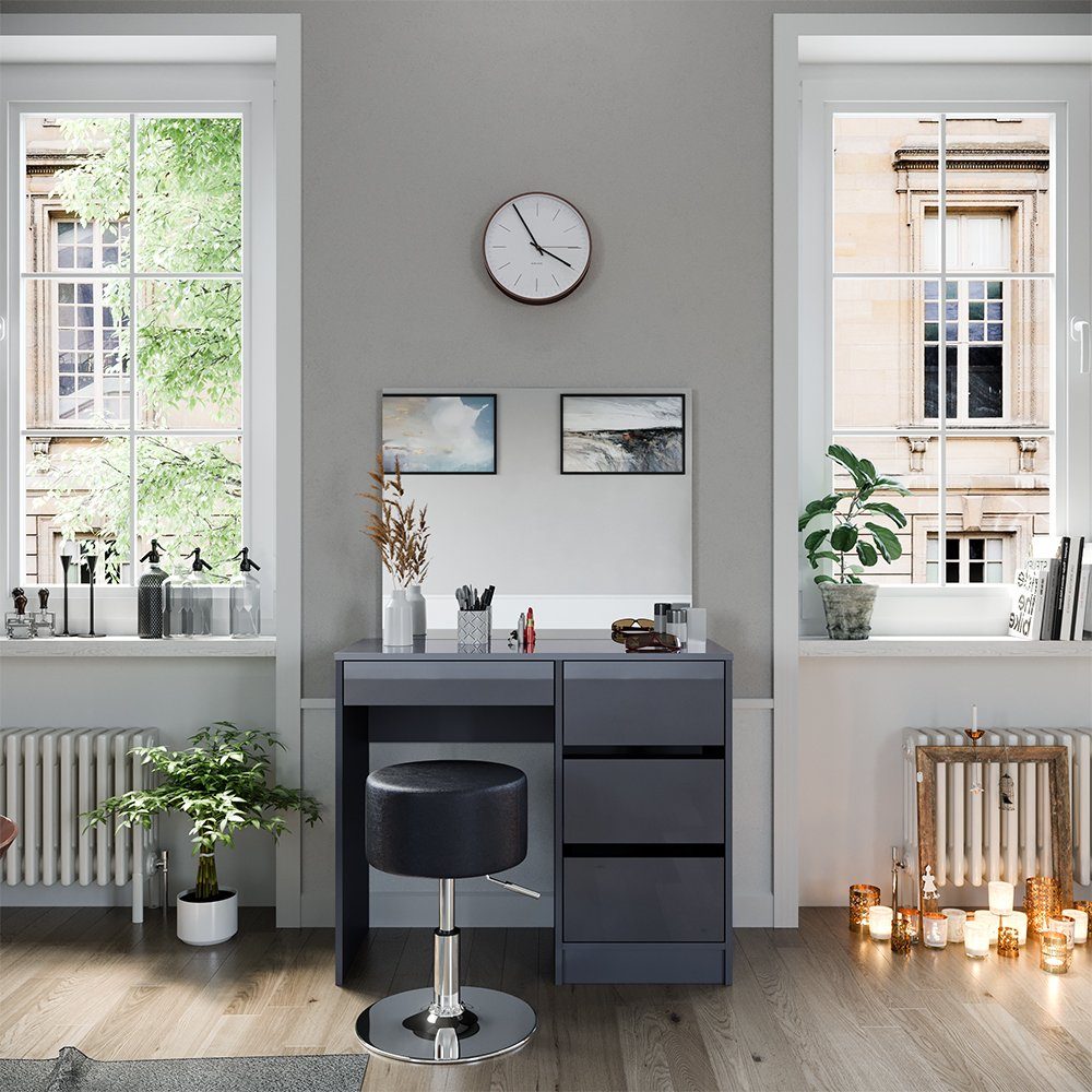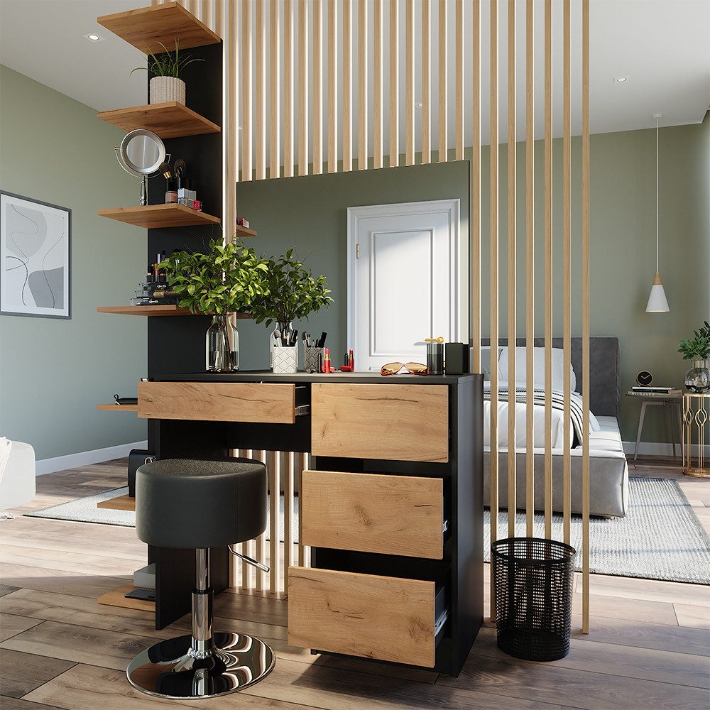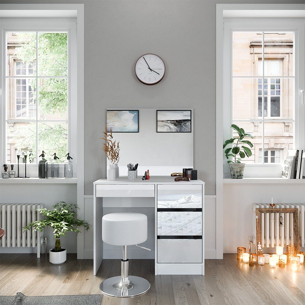 Der Schminktisch kommt mit einem bezaubernden Spiegel und einem bequemen Hocker. Vielseitige Aufbewahrungsmöglichkeiten sorgen dafür, dass Ihre Schönheitsprodukte immer griffbereit sind. Das moderne Design verleiht Ihrem Raum zeitlose Eleganz und Stil. Die einfache Montage ermöglicht Ihnen eine mühelose Einrichtung Ihrer persönlichen Beauty-Oase.
