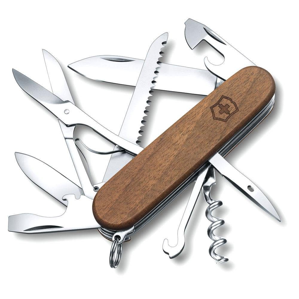 Funktional und trotzdem elegant: Mit seinen 13 wichtigen Funktionen hat das Schweizer Taschenmesser Huntsman Wood dennoch ein schlankes Profil. Seine Schalen bestehen aus elegantem, robustem Nussbaumholz. Durch das Holz wirkt es wie handgefertigt und fühlt sich sehr angenehm an. Aufgrund seiner natürlichen Maserung ist jedes Exemplar einzigartig. Das Messer ist aber trotz seiner Leichtigkeit, edlen Optik und der sanften Haptik ein absolut robuster Begleiter – im täglichen Gebrauch und Abenteuer, ob in der Hosentasche oder im Werkzeugkasten getragen.