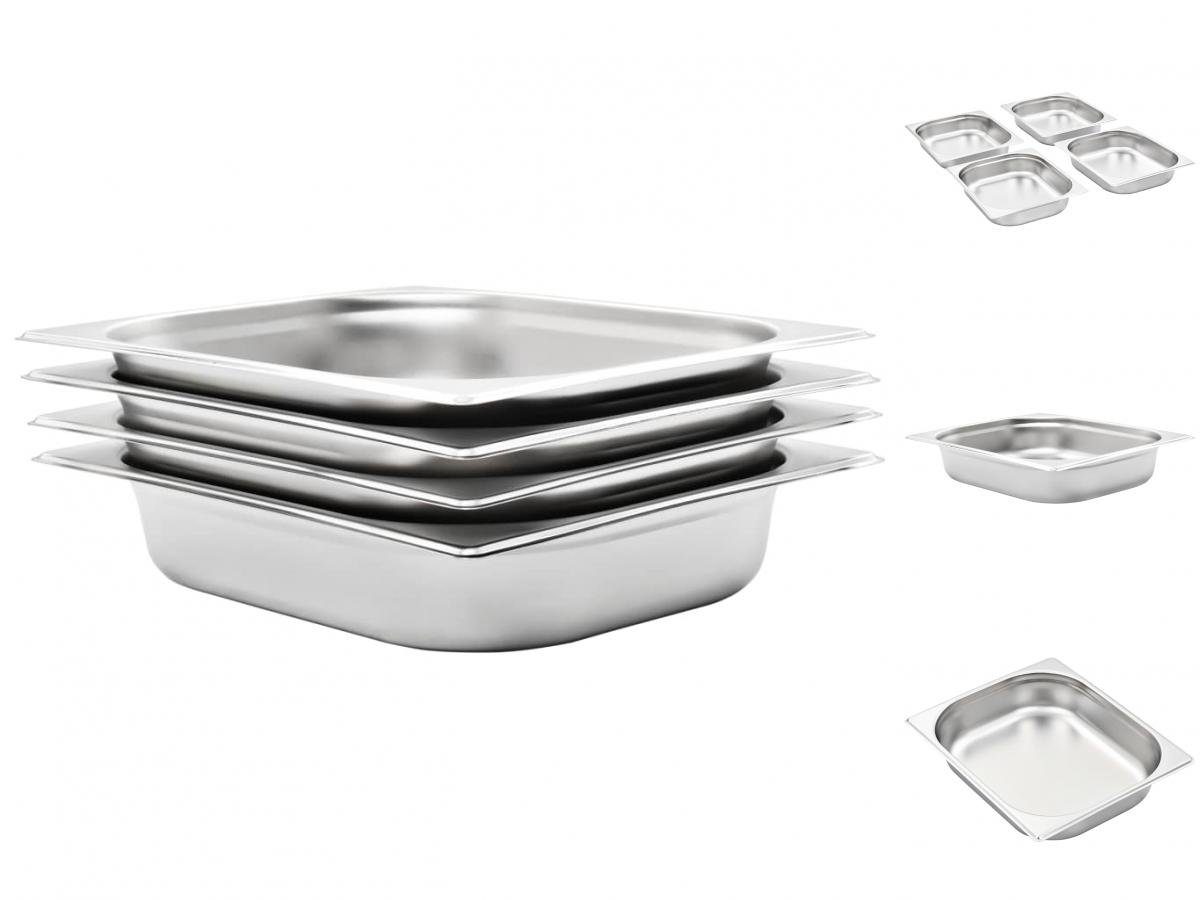Diese stapelbaren Gastronorm-Behälter sind eine großartige Ergänzung zu Ihrem Küchengeschirr. Aus robustem Edelstahl gefertigt, weist der Gastronorm-Behälter eine solide Konstruktion auf. Dank des strapazierfähigen Materials ist er kratzfest und leicht zu reinigen. Das Bratblech mit Standard-Gastronorm- Abmessungen ermöglicht einen universellen Einsatz und eine Vielzahl von Kombinationen. Folglich passt es perfekt in alle professionelle Küchenschränke. Es eignet sich hervorragend für Bain-Marie, Chafing-Dishes und Salatbars. Das Kochgeschirr ist zudem stapelbar und kann demnach platzsparend verstaut werden. Daher ist sie sehr praktisch und ideal für den Einsatz in Restaurants, Hotels, auf Partys sowie zu Hause geeignet. Lieferung umfasst 4 Kochgeschirre.