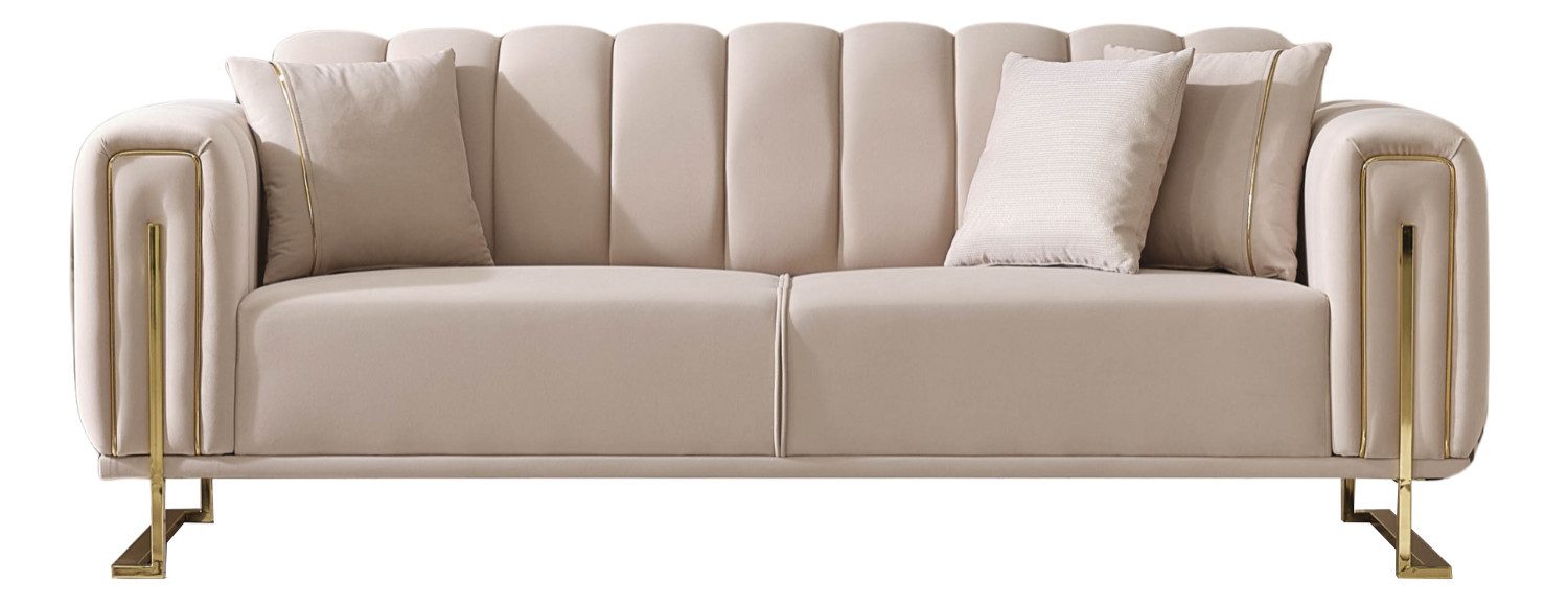 Das Boris Sofa begeistert mit seinem weichen Samtstoff in edlem Creme, der für eine elegante und gemütliche Atmosphäre sorgt. Die glänzenden Metallfüße in Gold verleihen dem Design eine glamouröse Note und sorgen zugleich für Stabilität. Die klar strukturierte Rückenpartie und die formschönen Armlehnen unterstreichen den stilvollen Gesamtauftritt.