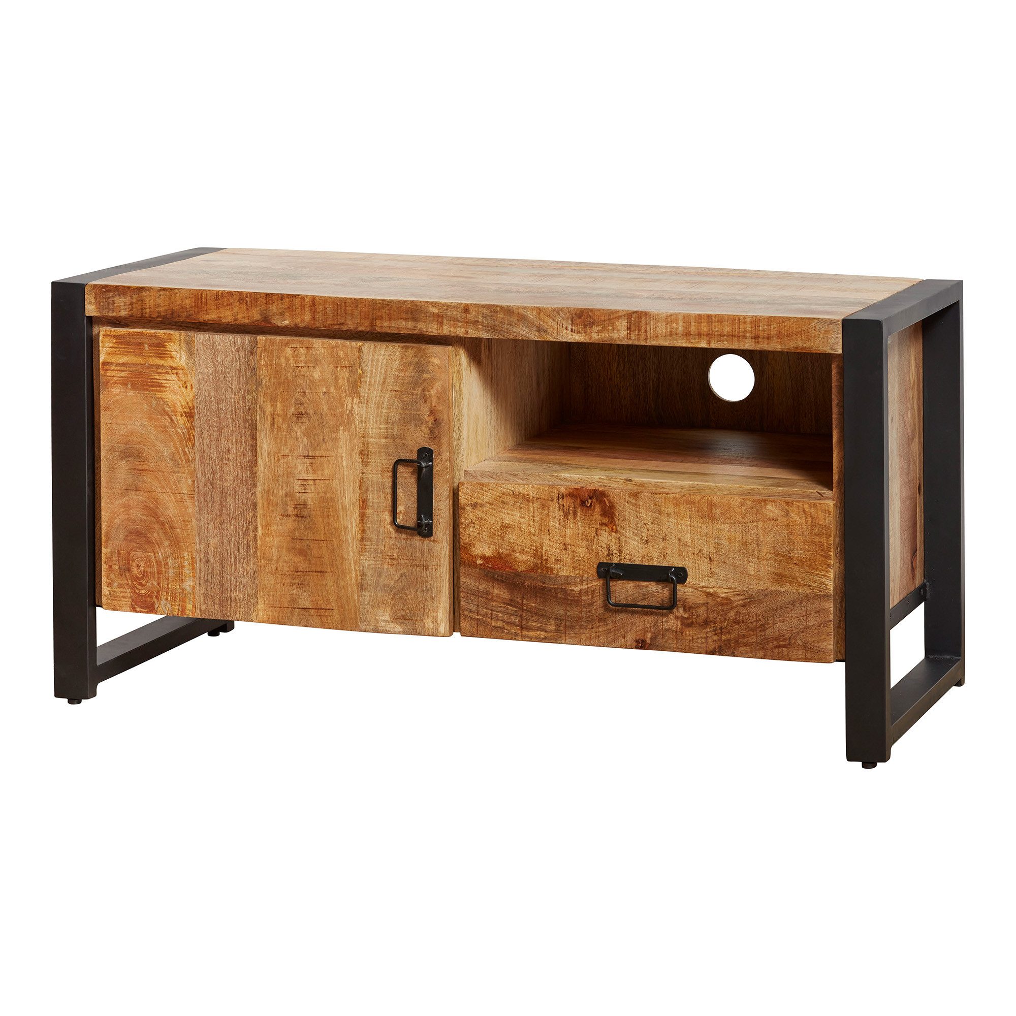 Der TV-Möbel aus unserer Zavan-Serie verfügt über eine T ür und ein offenes Fach. Der Schrank ist aus massivem Mangoholz und Metall gefertigt. Das Mangoholz ist mit einer Schutzschicht versehen, während der Rahmen und die Griffe schwarz lackiert sind.Abmessungen: - Breite: 110 cm - Tiefe: 45 cm - Höhe: 55 cmPflegehinweise: Mit einem leicht feuchten Tuch abwischen.Montage: Selbstmontage.