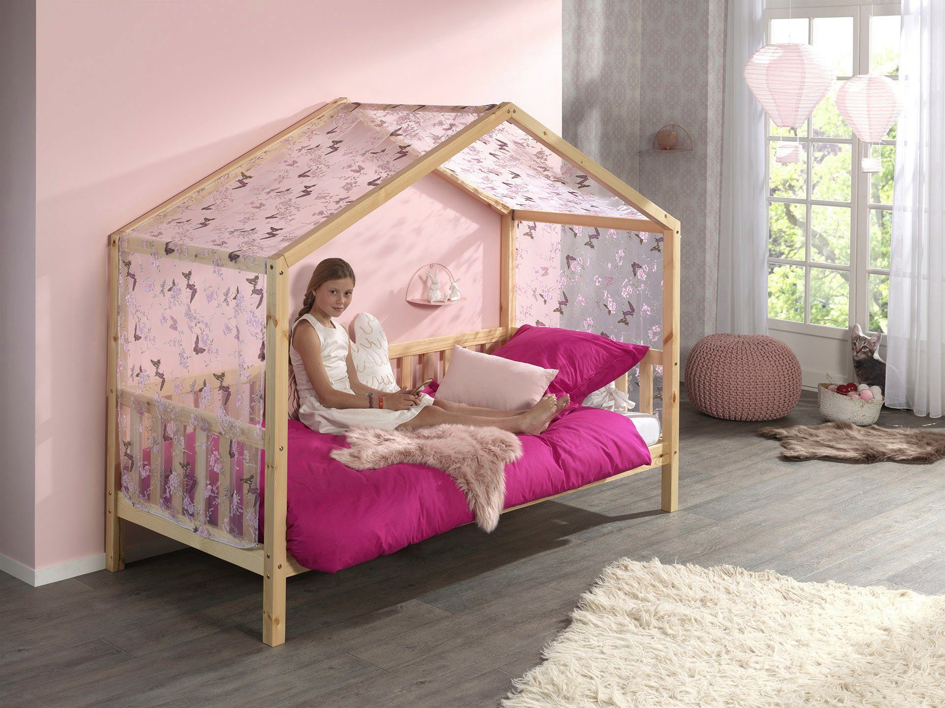 So nackig würde ich das Bett nicht stehen lassen und der Haus-Aufbau schreit ja förmlich nach Textilien. Jetzt mit einem blauen Sternenhimmel aus Organza bildet das Ganze eine heimelige Höhle, die den Schlafplatz gut vom restlichen Zimmer abgrenzt. Einen kleinen Minuspunkt vergeben wir für die sehr sichtbaren Schrauben, da hätte man vielleicht etwas an der Positionierung verbessern oder Abdeckkappen beilegen können.