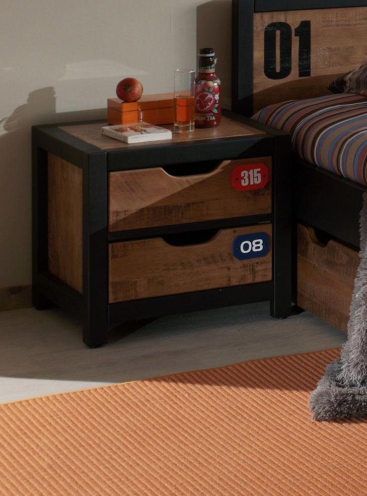 Wissenswertes | Nachttisch mit 2 geräumigen Schubladen, passend zum Programm »Alex«. Die Fronten und Seiten sind aus massiver Kiefer. Die Rahmenkonstruktion ist aus hochwertigem MDF, schwarz beschichtet. Die Oberfläche ist gehobelt, gebürstet und cognacfarbig gebeizt. Abgesetzt sind die Fronten mit netten Applikationen und Zahlen. Durch die ausgeschnittene Grifföffnung lassen sich die Schubladen leicht bedienen. Die Schubaden haben einen Metallauszug. Опис товару