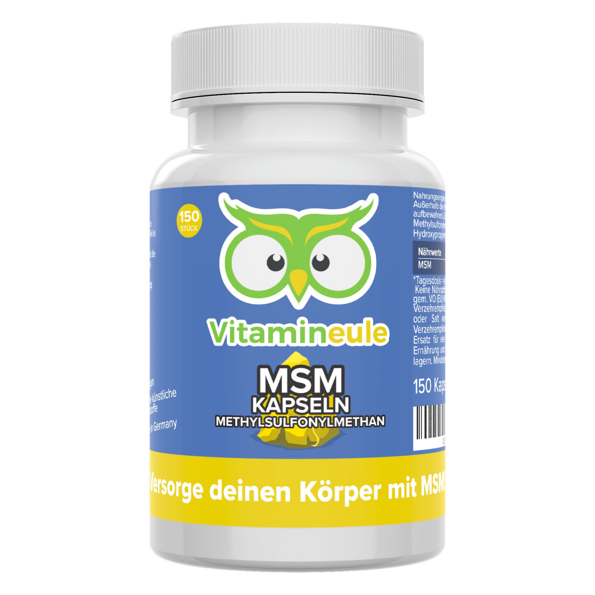 Methylsulfonylmethan (kurz MSM) ist organisch gebundener Schwefel, der natürlicherweise in Muskeln, der Haut und den Knochen vorkommt. Unsere MSM Kapseln enthalten 700 mg reines MSM und werden unter strengen Bedingungen in Deutschland gefertigt. Sie sind frei von künstlichen Zusatzstoffen und ideal für eine langfristige Ergänzung geeignet. Jede Dose Vitamineule® MSM Kapseln enthält 150 Kapseln.