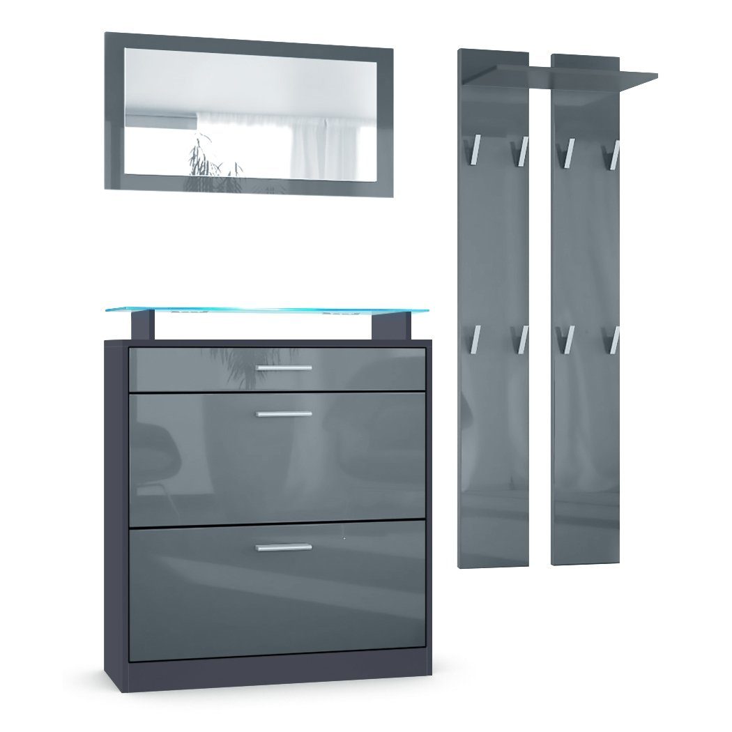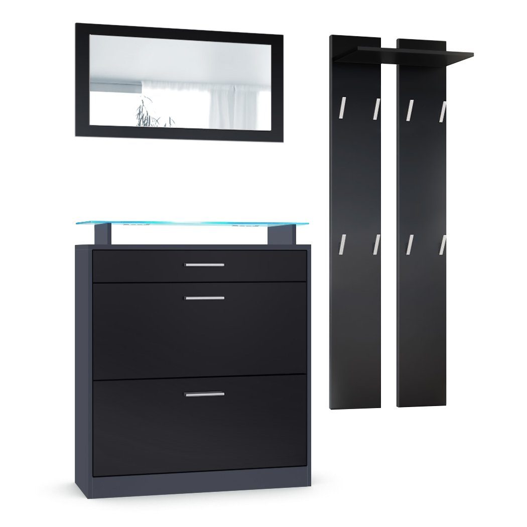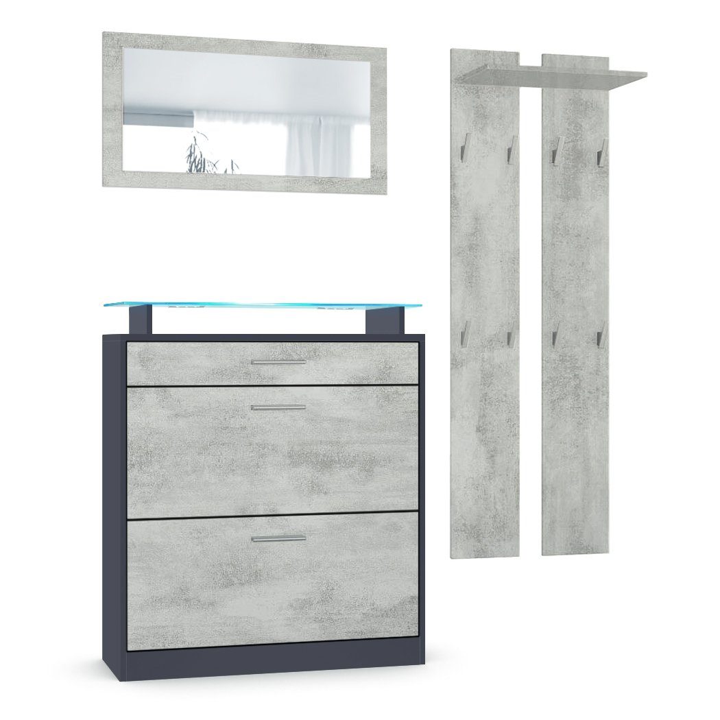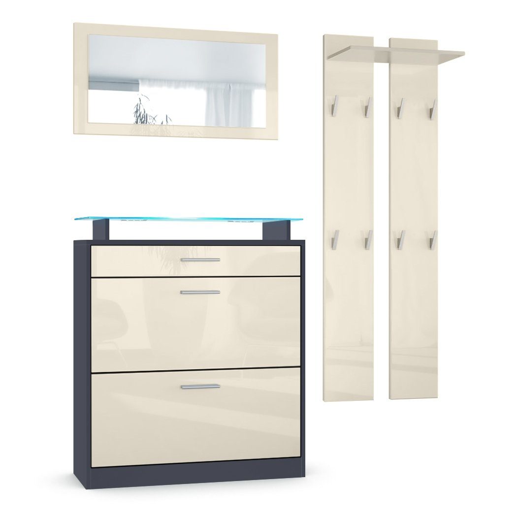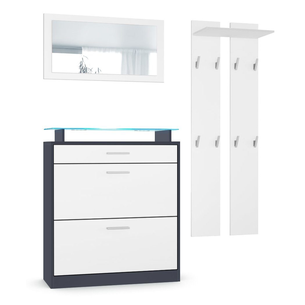 Die moderne Garderobe Loret mini besteht aus einem Schuhschrank, zwei Wandpaneelen mit jeweils vier Garderobenhaken, einem Ablagefach und einem zusätzlich dekorativen Wandspiegel, hergestellt in Deutschland. Всі vier Flurmöbel lassen sich individuell zusammenstellen und bieten grenzenlose Gestaltungsmöglichkeiten für Ihren Flur oder die Diele. Der Schuhschrank bietet mit zwei Schuhkippern, einer Schublade und einer Glasablage genug Platz für bis zu 16 Paar Schuhe und weitere Accessoires. Der Schuhschrank enthält keine Rückwand.