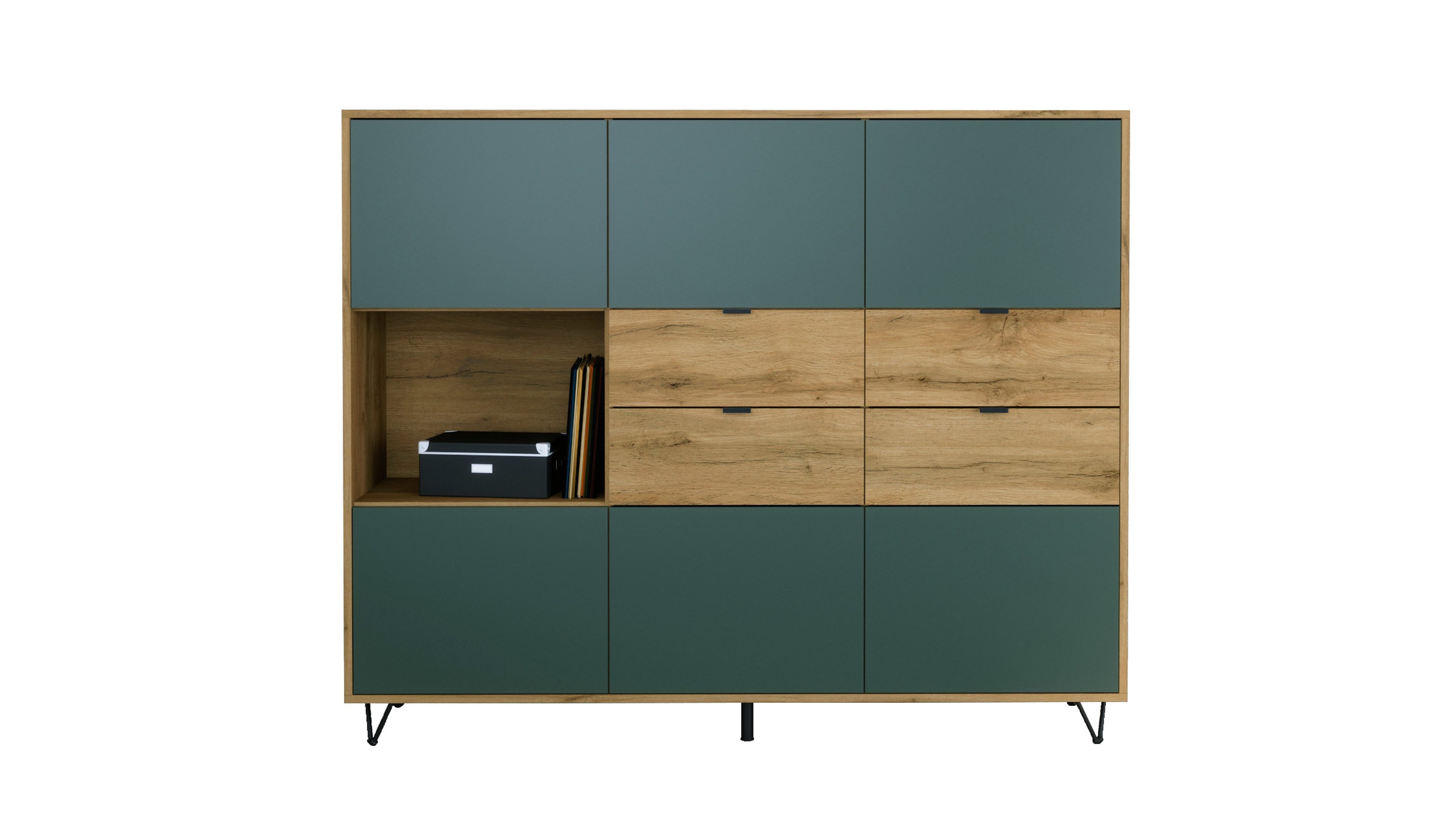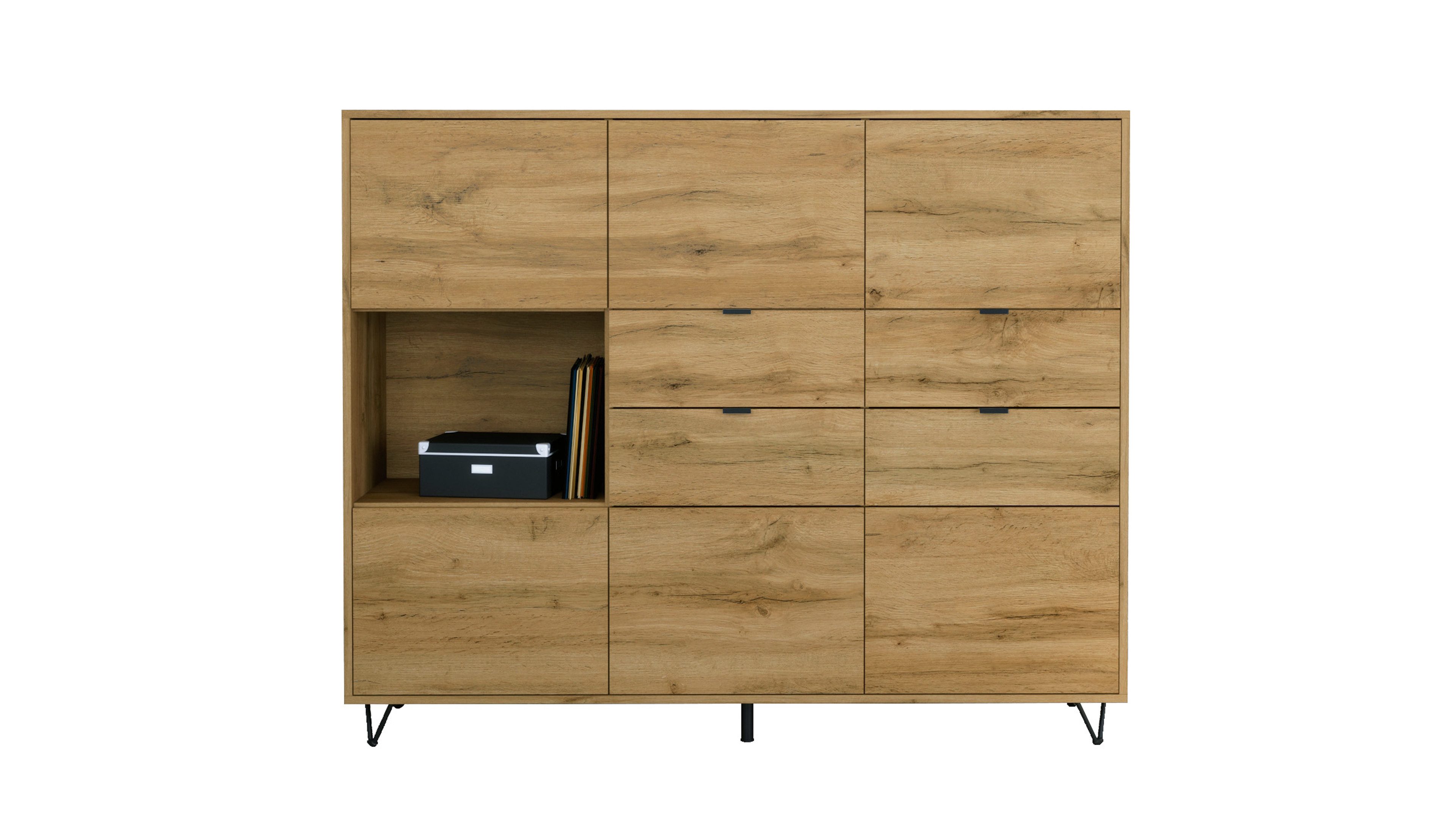 In der oberen und unteren Reihe befinden sich jeweils drei Türen mit Push-to-Open-Funktion, die sechs geschlossene Fächer verbergen – ideal als Kommode, Schrank oder Aufbewahrungsschrank. Auf der linken Seite befindet sich ein offenes Fach für Bücher, Deko oder Technik. Daneben bieten vier praktische Schubladen mit schwarzen Metallgriffen zusätzlichen Stauraum – perfekt für Alltagsutensilien, Dokumente oder Besteck.