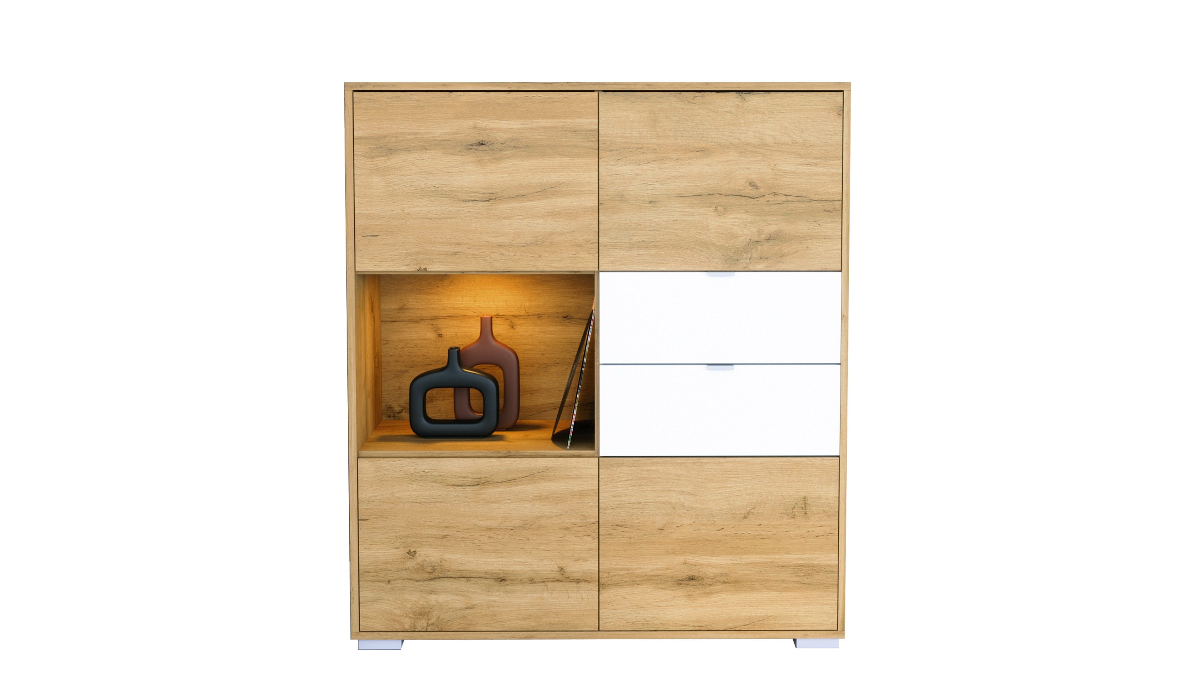 Oben und unten befinden sich jeweils zwei Türen mit Push-to-Open-Funktion, die insgesamt vier geschlossene Innenfächer bieten – ideal als Kommode, Highboard, Schrank oder Aufbewahrungsschrank. Auf der linken Seite sorgt ein offenes Fach mit LED für dekorative Akzente oder Technik. Direkt rechts daneben befinden sich zwei praktische Schubladen mit hochwertigen Metallgriffen, perfekt für Besteck, Unterlagen oder Kleinartikel.