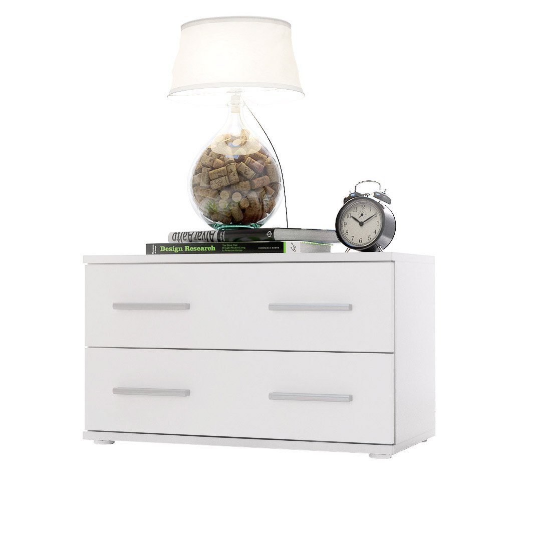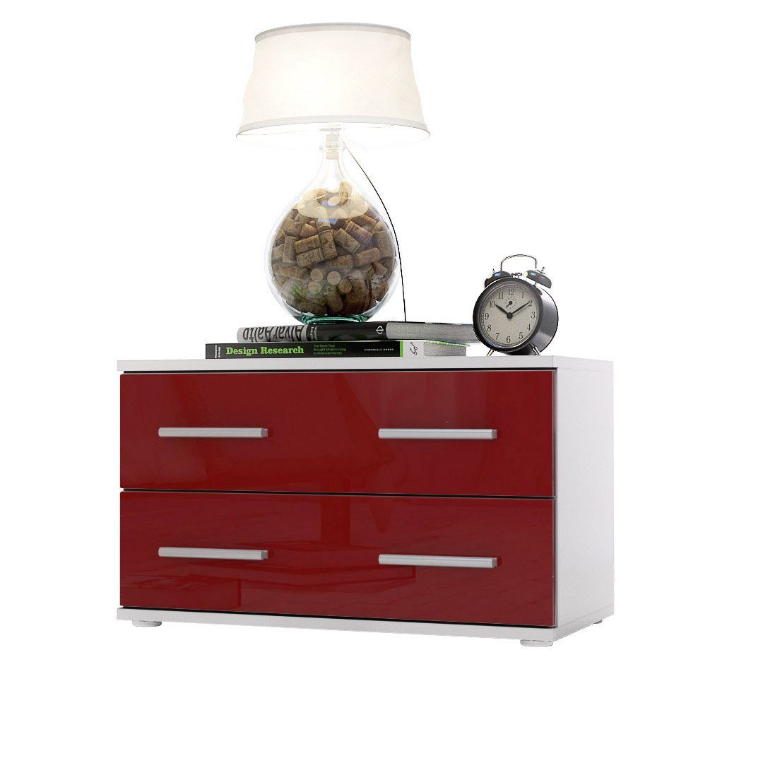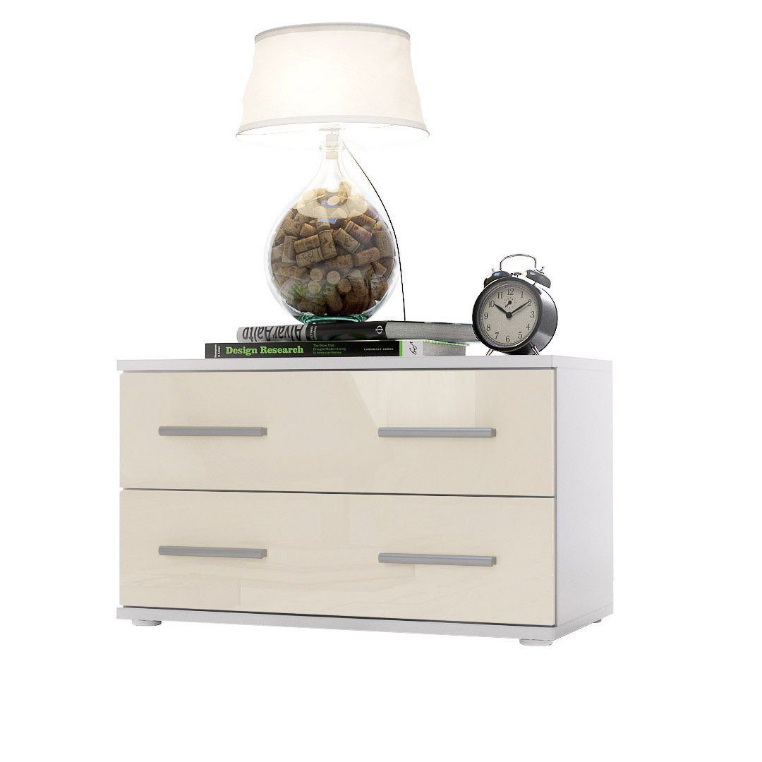 Der Korpus der Bettkommode ist elegant in Weiß matt melaminbeschichtet, was dem Möbelstück eine stilvolle Note verleiht.