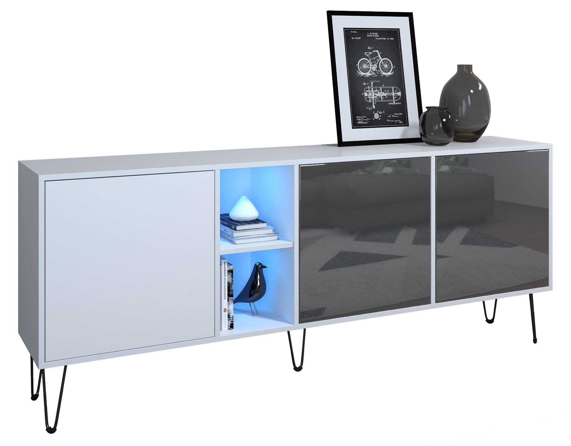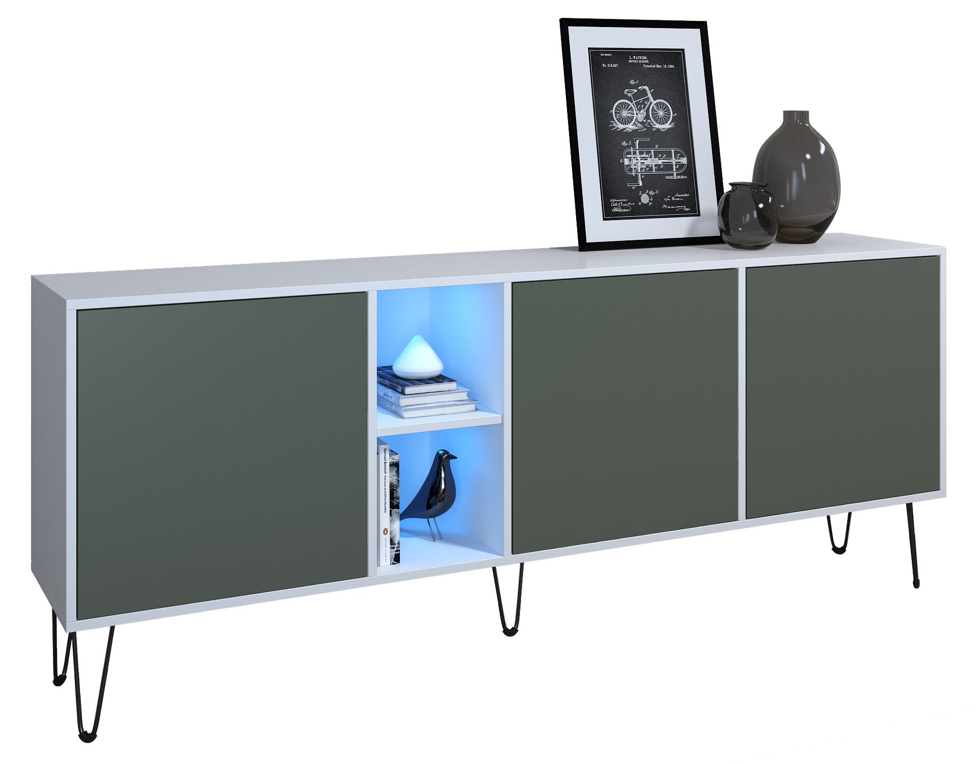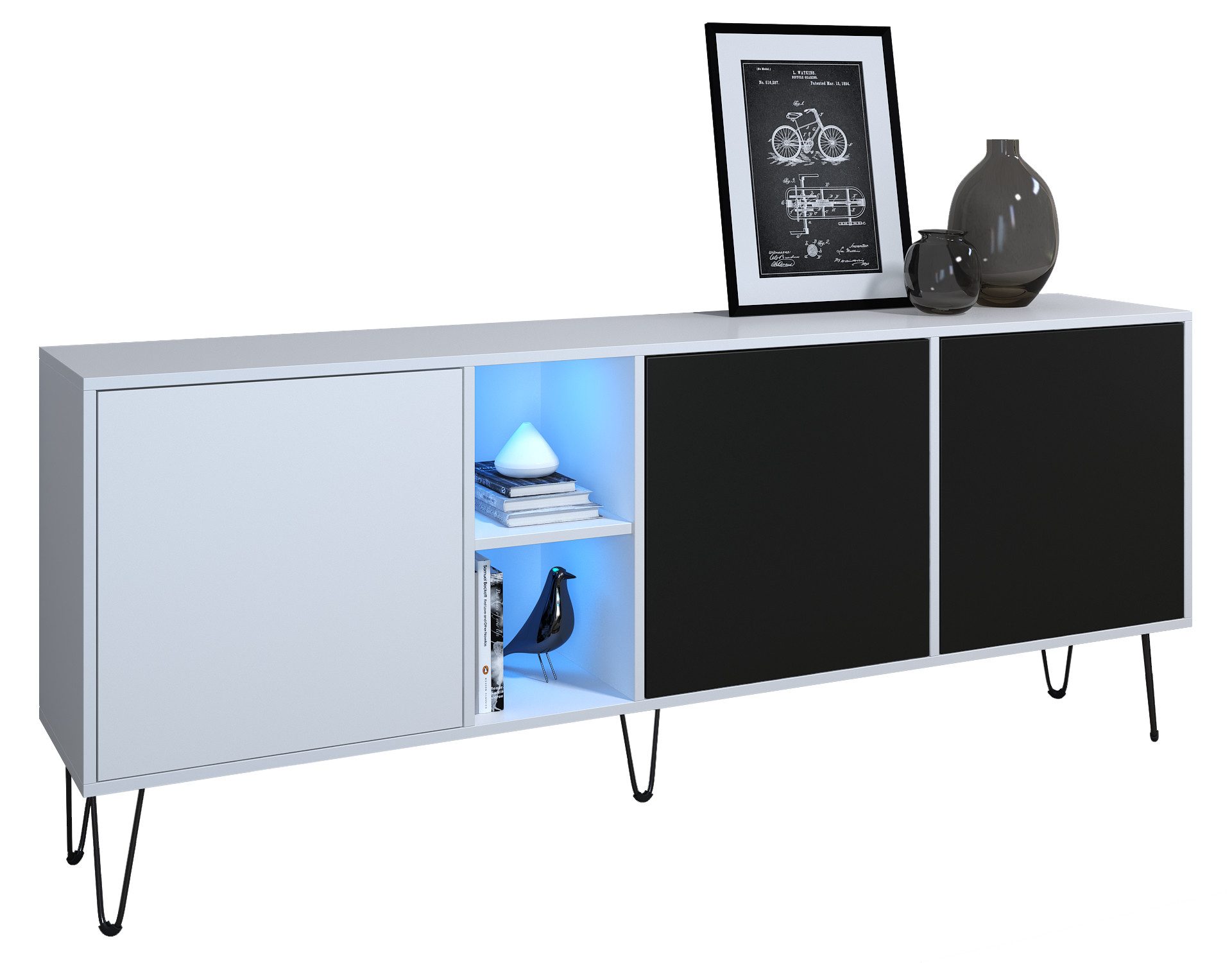 Das Havana Sideboard verbindet minimalistisches Design mit cleverem Stauraum. Der Korpus in Weiß matt sorgt für eine zeitlose Optik und elegante Ausstrahlung. Schwarze Füße setzen stilvolle Akzente und geben Stabilität. Die Fronten sind wählbar in verschiedenen Варіантиn – ideal für Wohnzimmer, Esszimmer, Schlafzimmer oder Flur. Die integrierte LED-Beleuchtung setzt Ihre Einrichtung zusätzlich in Szene.