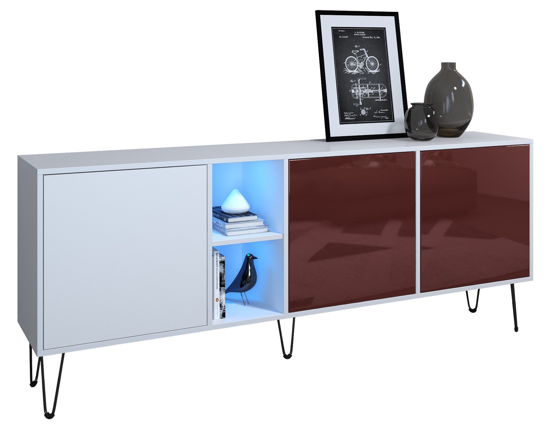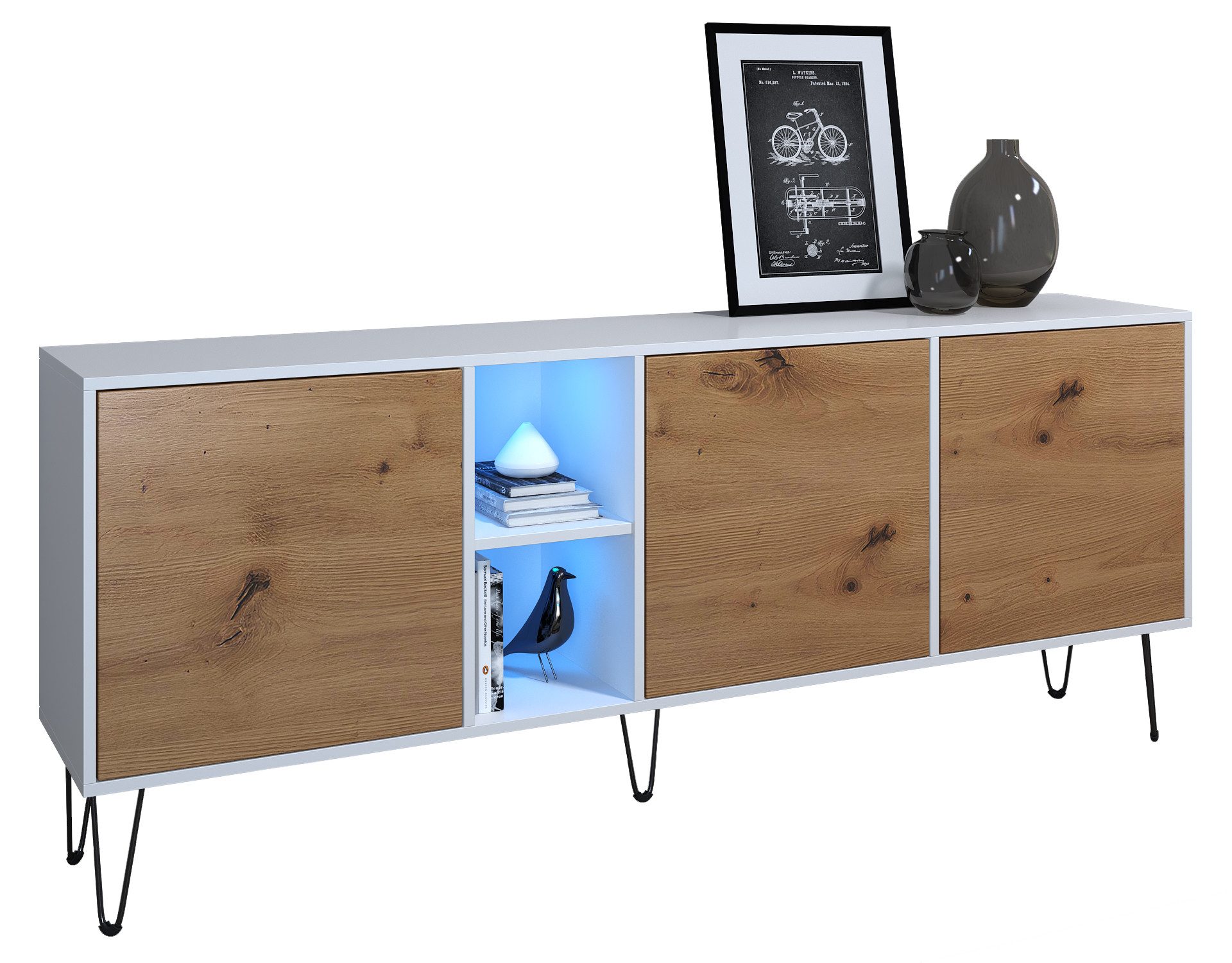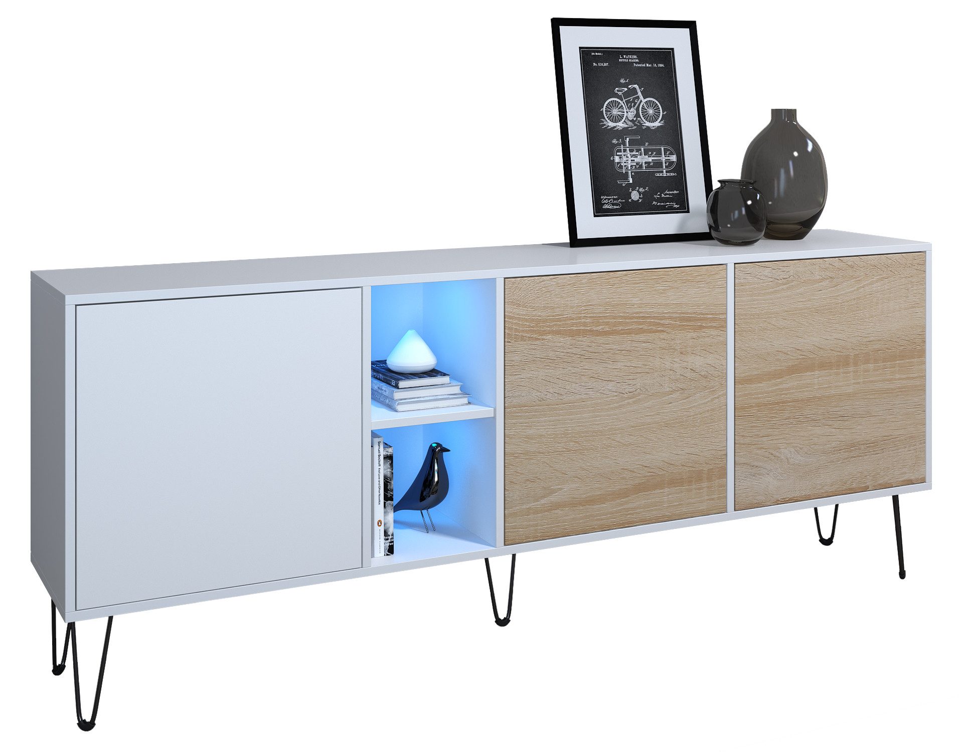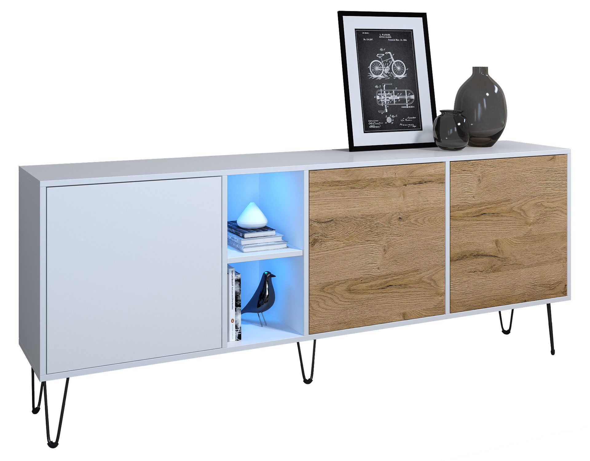 Das Havana Sideboard verbindet minimalistisches Design mit cleverem Stauraum. Der Korpus in Weiß matt sorgt für eine zeitlose Optik und elegante Ausstrahlung. Schwarze Füße setzen stilvolle Akzente und geben Stabilität. Die Fronten sind wählbar in verschiedenen Варіантиn – ideal für Wohnzimmer, Esszimmer, Schlafzimmer oder Flur. Die integrierte LED-Beleuchtung setzt Ihre Einrichtung zusätzlich in Szene.