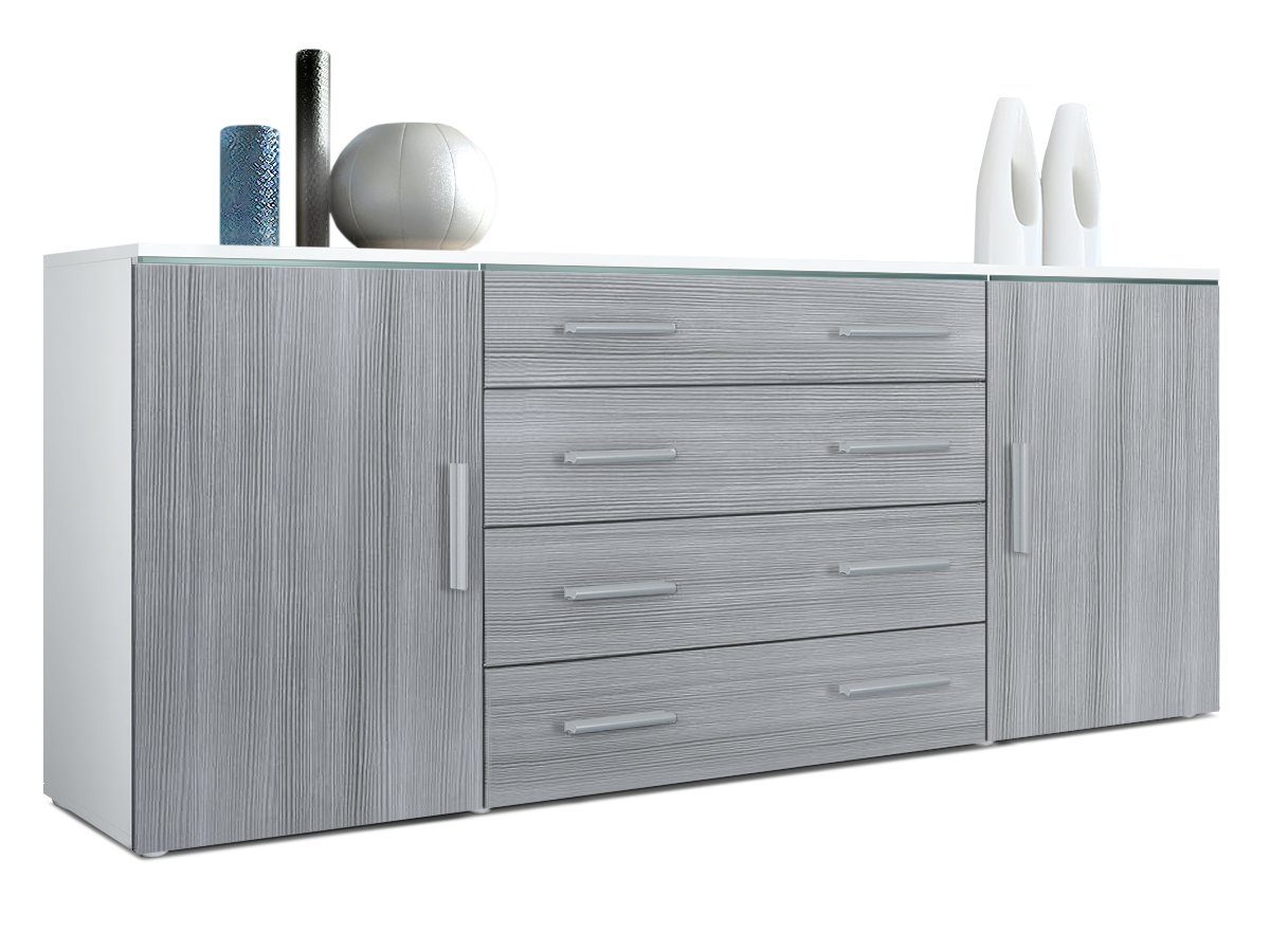 Gefertigt aus melaminbeschichteter Spanplatte überzeugt das Sideboard durch Stabilität, Langlebigkeit und Pflegeleichtigkeit. Die silberfarbenen Kunststoffgriffe und Teleskopschienen aus Metall sorgen für komfortable Handhabung.