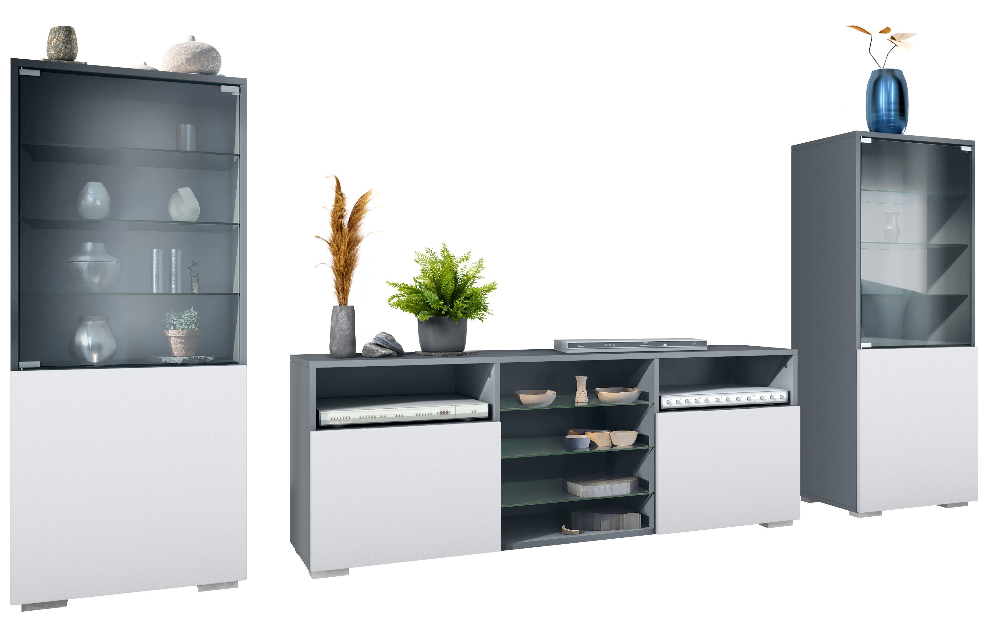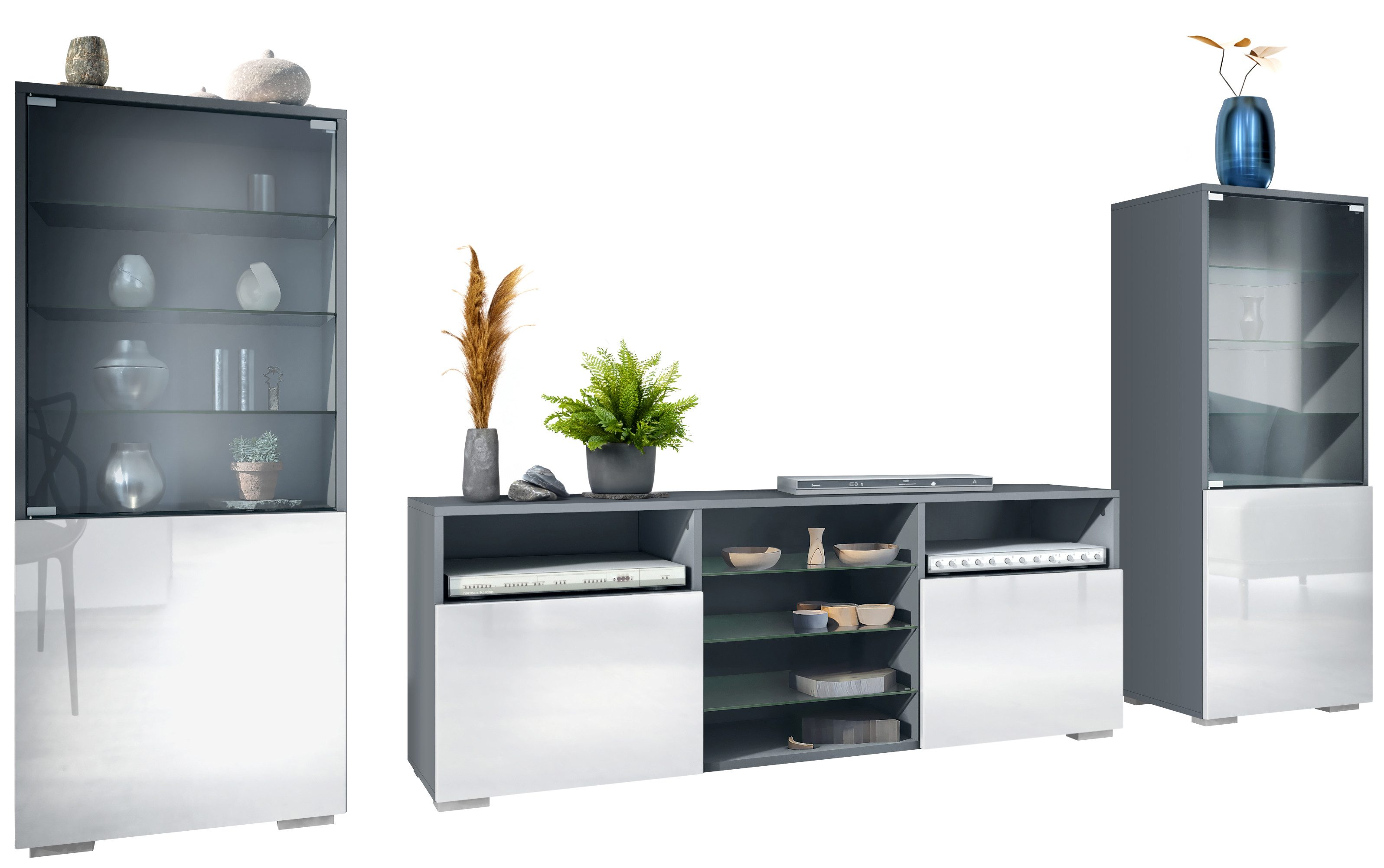 Entdecken Sie die vielseitige und moderne Granada Wohnwand, bestehend aus zwei Vitrinen und einem Lowboard. Diese Wohnzimmermöbel vereinen Qualität, Flexibilität und modernes Design, um Ihren Wohnraum stilvoll zu gestalten.