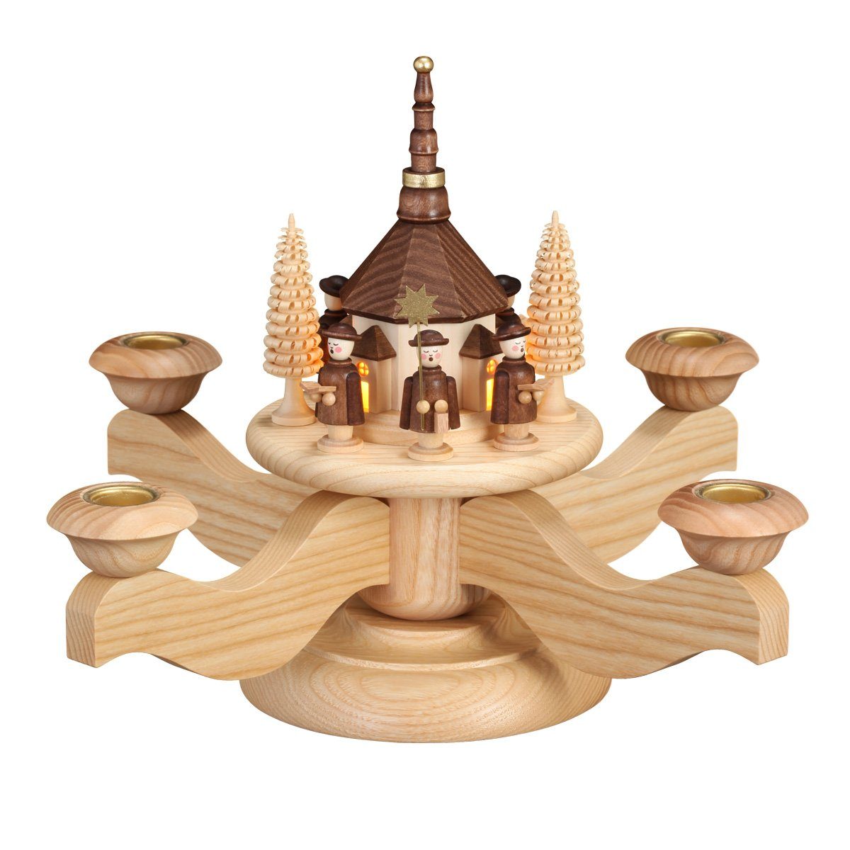 Erzgebirgische Adventsleuchter bilden seit den Anfängen der Holzkunstherstellung einen festen Bestandteil einer weihnachtlichen Tischdekoration. Vormals mit wichtiger Funktion – hauptsächlich als Lichtquelle – dienen sie heute eher als Dekoration, möglichst mit einem eingelegten Adventskranz aus satten Reißigzweigen. Dem Brauchtum nach sollte an jedem Advent jeweils eine weitere der vier Kerzen angezündet werden. Auch wir haben die Geschichte des Leuchters mitgeprägt - der Volkskunstwerkstatt Unger ist es zu verdanken, dass erstmals 1992 eine innenbeleuchtete Seiffener Kirche umsäumt von sechs Kurrendesängern als Motiv einen Tischleuchter zierte. Die Beleuchtung wird mit einer auswechselbaren AAA-Batterie betrieben, die eine Leuchtdauer von ca. 100 Stunden hat. Der Schalter befindet sich an der Motivplatte.Jeder unserer Artikel wird aufwändig per Hand montiert und mehrmals ausgerichtet, damit Sie ein Produkt erhalten, an dem Sie und auch nachfolgende Generationen noch Ihre Freude haben. Wir sind zertifizierter Hersteller Original Erzgebirgischer Volkskunst.