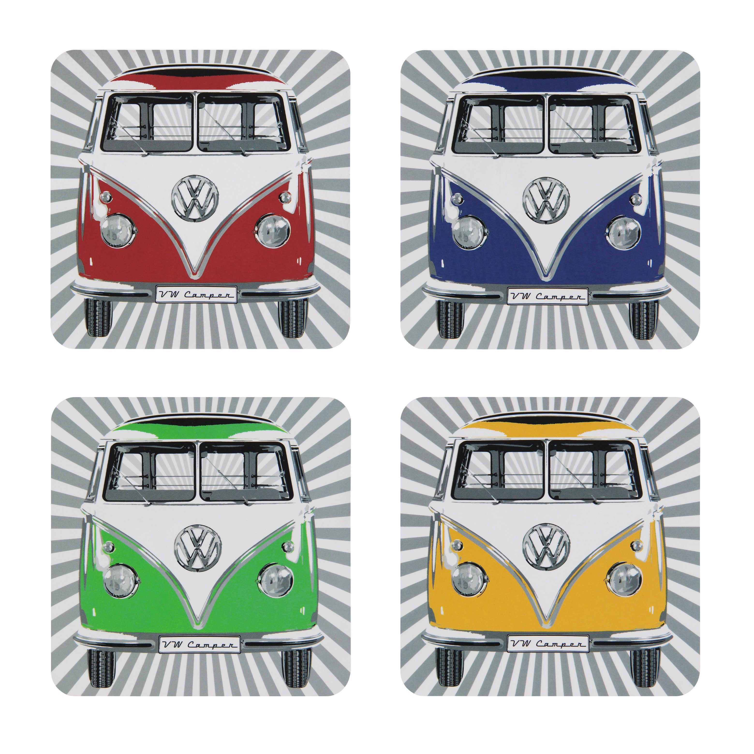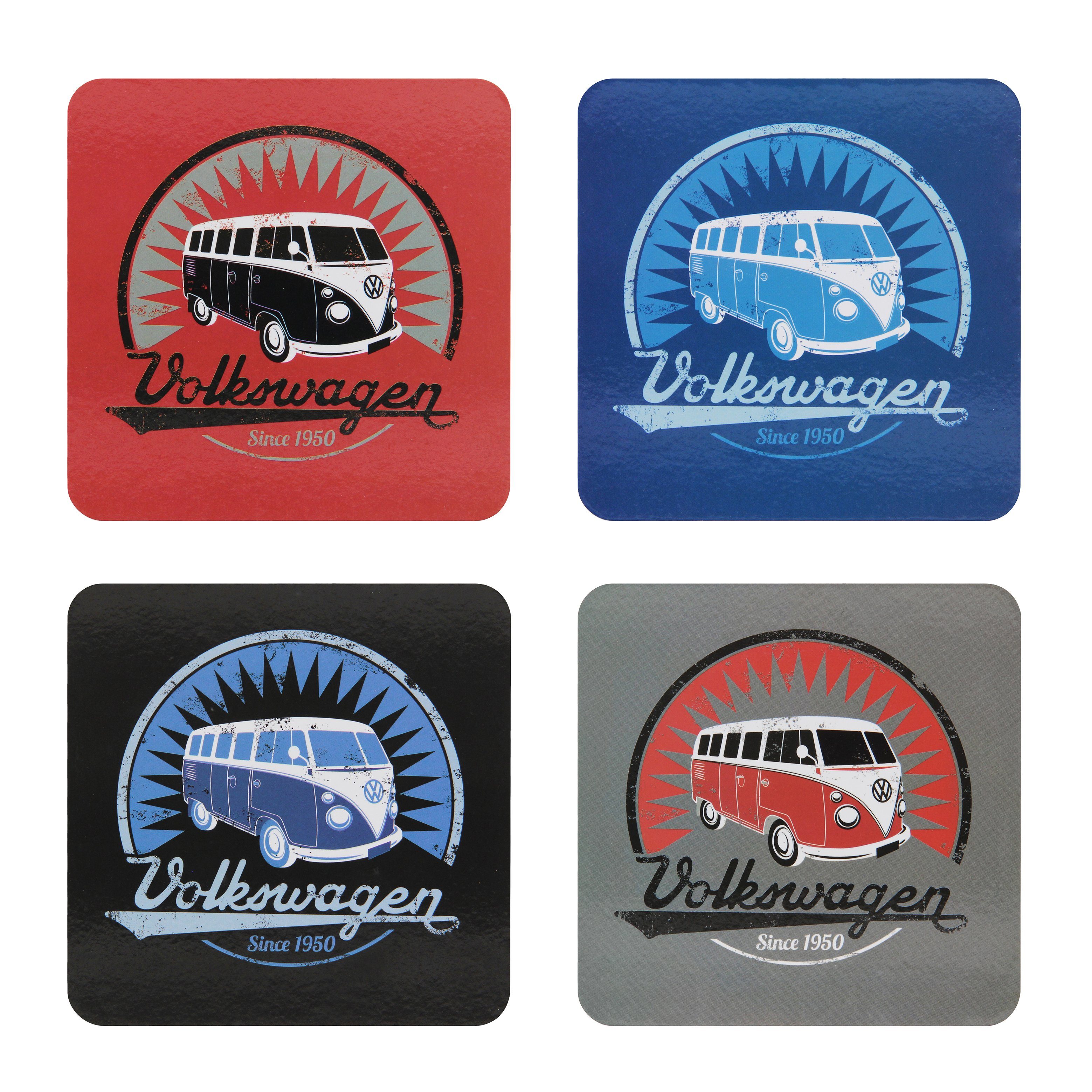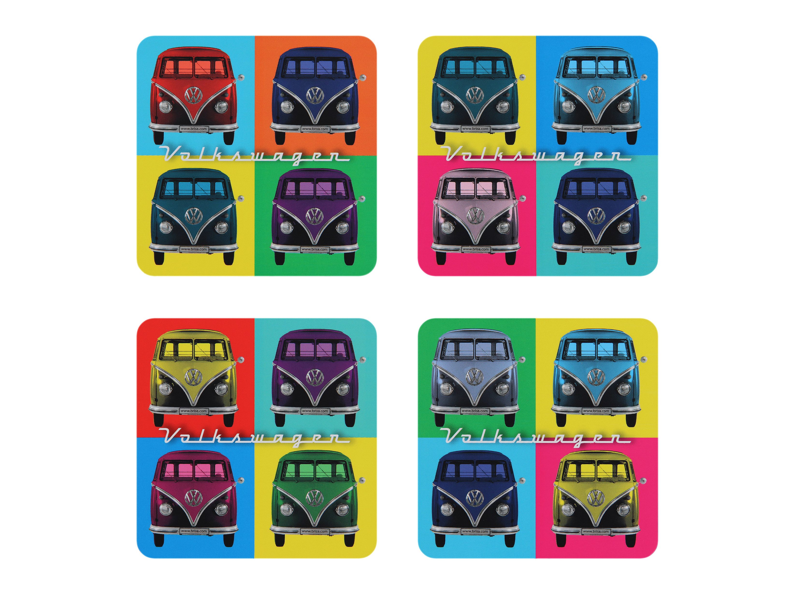 Witziges 4er Set mit trendigem VW „Bulli“ Bus/Campervan Motiv. Die Untersetzer helfen im Haushalt, Ihren Tisch sauber und kratzfrei zu halten. Als Dekor für jede Anrichte ein schöner Fanartikel und Accessoire! Der weiche Untersetzer bietet sich zum Abstellen von Weingläsern, Teetassen in Küche, Esszimmer oder im Büro an. Die rutschfesten Untersetzer im Retro-Style peppen jede Tischgarnitur auf und sind ein schöner Blickfang. Sie sind ideal für den täglichen Gebrauch und lassen jedes VW T1 Bulli Herz gleich höherschlagen. Es punktet als tolles Retro-Geschenk bei jedem Gastgeber punkten.