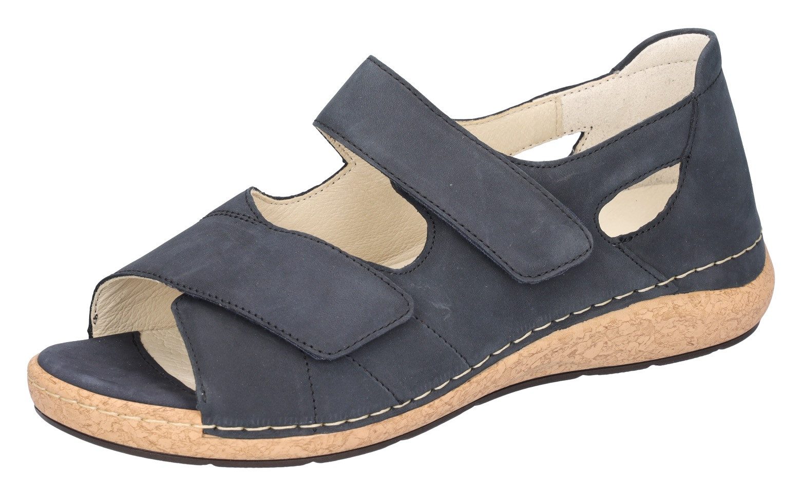 Mit den Sandalen der Marke Waldläufer ist dein Urlaubs-Outfit komplett. Damit kannst du stilvoll und bequem die warmen Sommerabende genießen. Durch die Klettverschlüsse kann der Schuh in der Weite reguliert sowie schnell an- und ausgezogen werden. Dank der profilierten Sohle aus Synthetik sorgen die Sandalen für mehr Rutschfestigkeit auf unebenem Untergrund. Dank dem Keilabsatz ist eine größere Absatzhöhe möglich, ohne den Komfort und die Stabilität zu beeinträchtigen.