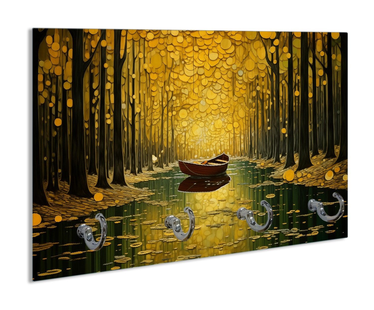 In der Stille eines geheimnisvoll wirkenden Waldes ruht ein verlassenes Boot auf dem spiegelglatten Wasser, das vom goldgelben Leuchten des Lichts durchdrungen ist. Die Umrisse der Bäume spiegeln sich auf der Wasserfläche, kreieren ein Muster aus Licht und Schatten und laden den Betrachter zu einer stillen Betrachtung ein.