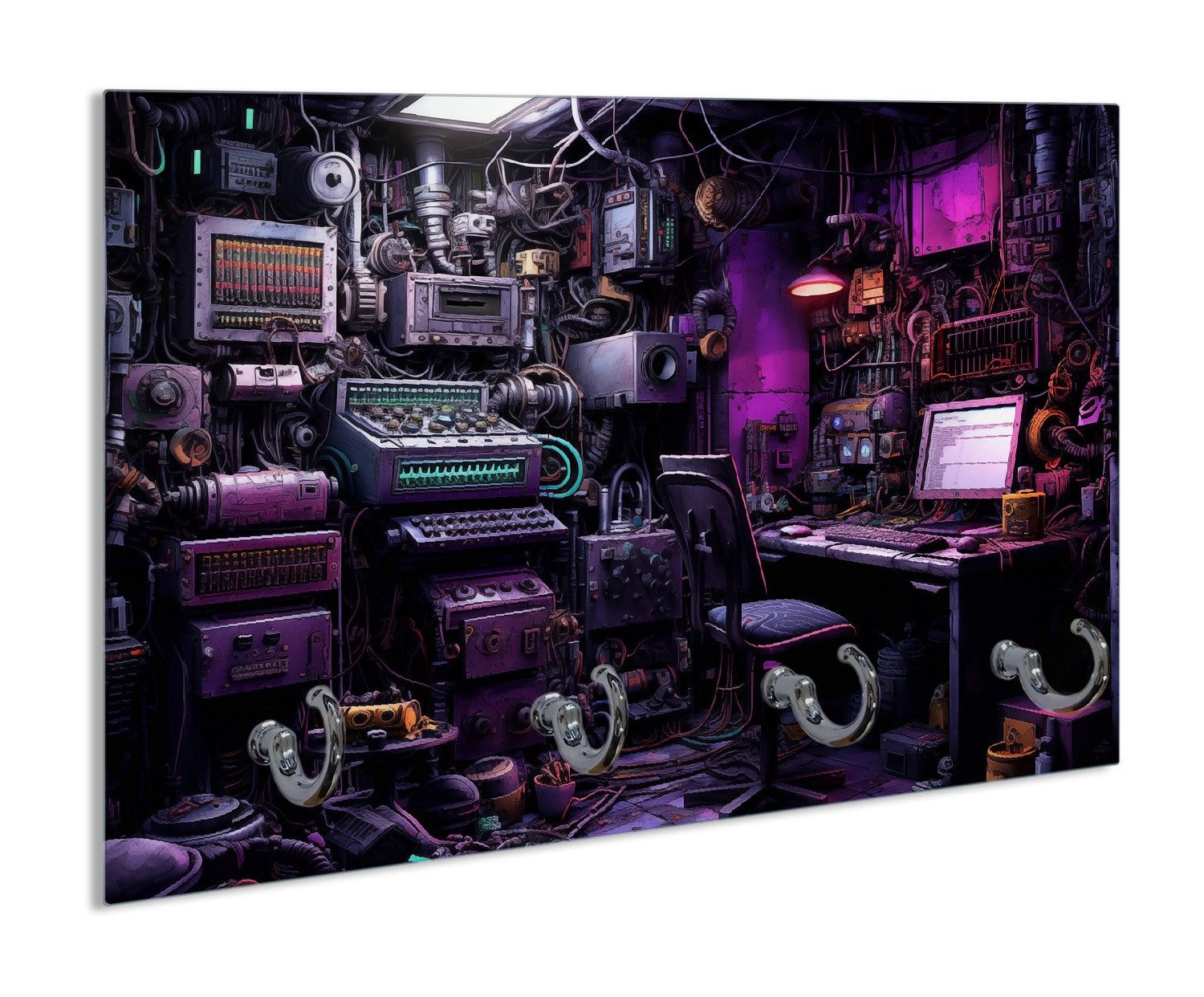 In einem düsteren Raum voller alter, retrofuturistischer Technik zeigt sich das perfekte Versteck für einen Hacker. Kabel und Bildschirme dominieren das Bild, während Lichter in Violett und Pink die dunkle Umgebung erleuchten. Ein einzelner Computerbildschirm strahlt inmitten des organisierten Chaos, bereit für den nächsten großen Hack. Dieser Ort vereint die Ästhetik des Cyberpunk-Genres mit einem Hauch von Nostalgie, ideal für jeden, der sich in digitale Welten flüchtet.
