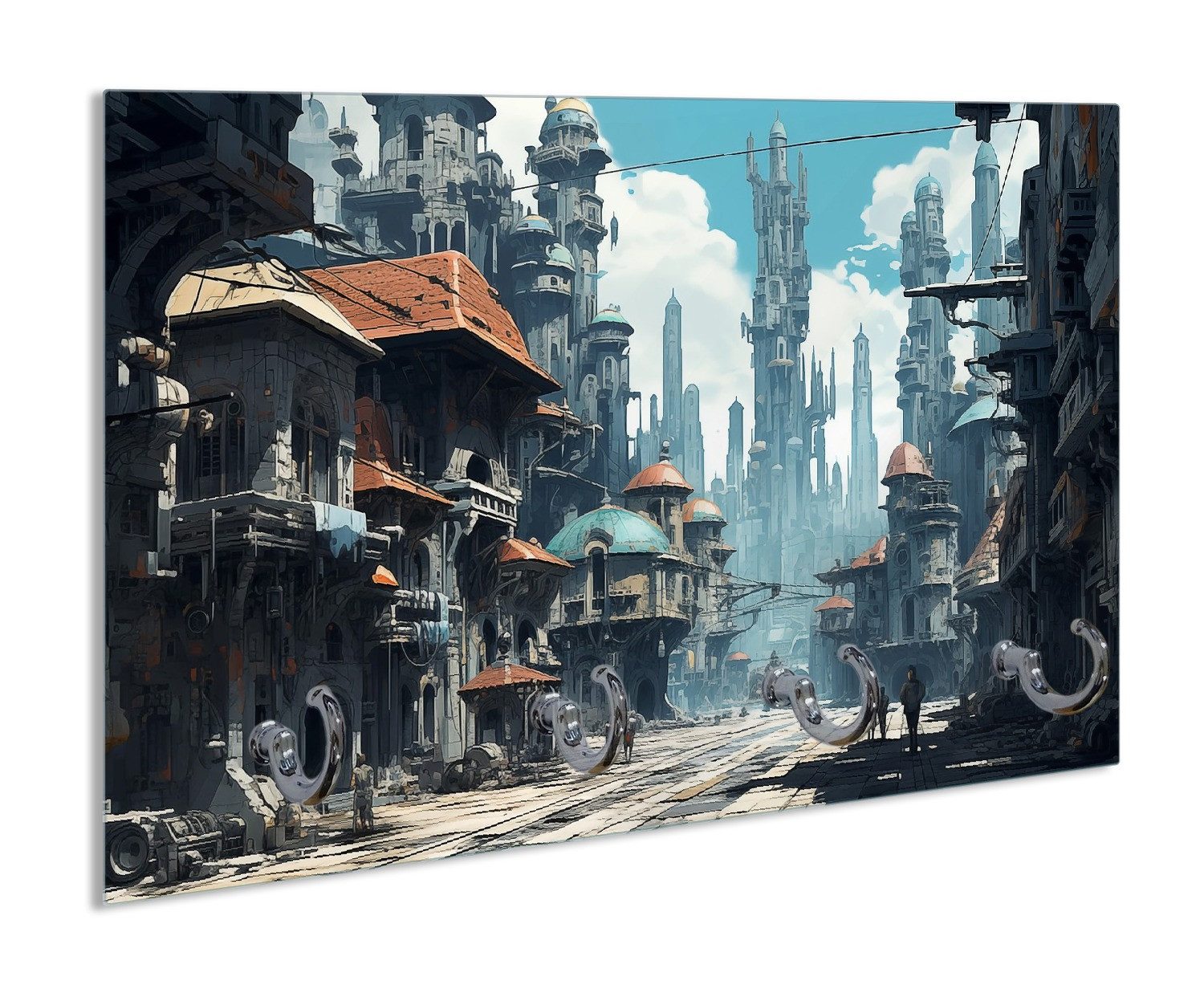 In dieser eindrucksvollen Szene erstreckt sich eine verlassene Stadt mit futuristischer Architektur unter einem klaren, blauen Himmel. Die Gebäude, die einst vor technologischer Innovation strotzten, wirken nun verlassen. Zerfallene Fassaden und menschenleere Straßen verleihen der Szenerie eine bedrückende Atmosphäre, die von einer vergangenen Zivilisation erzählt.