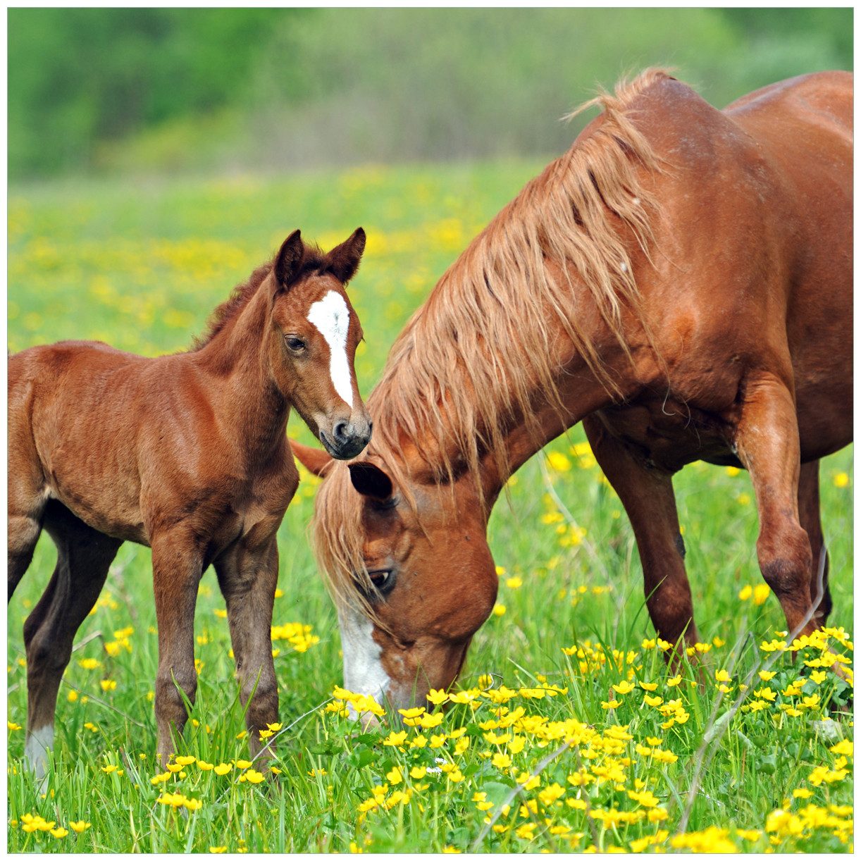 Dieses Fohlen steht neben seiner grasenden Mutter und schaut noch etwas verdattert in seine neue farbenfrohe Umgebung. Ein tolles Frühlingsmotiv mit zwei Pferden auf einer satten Wiese mit vielen gelben Blumen.