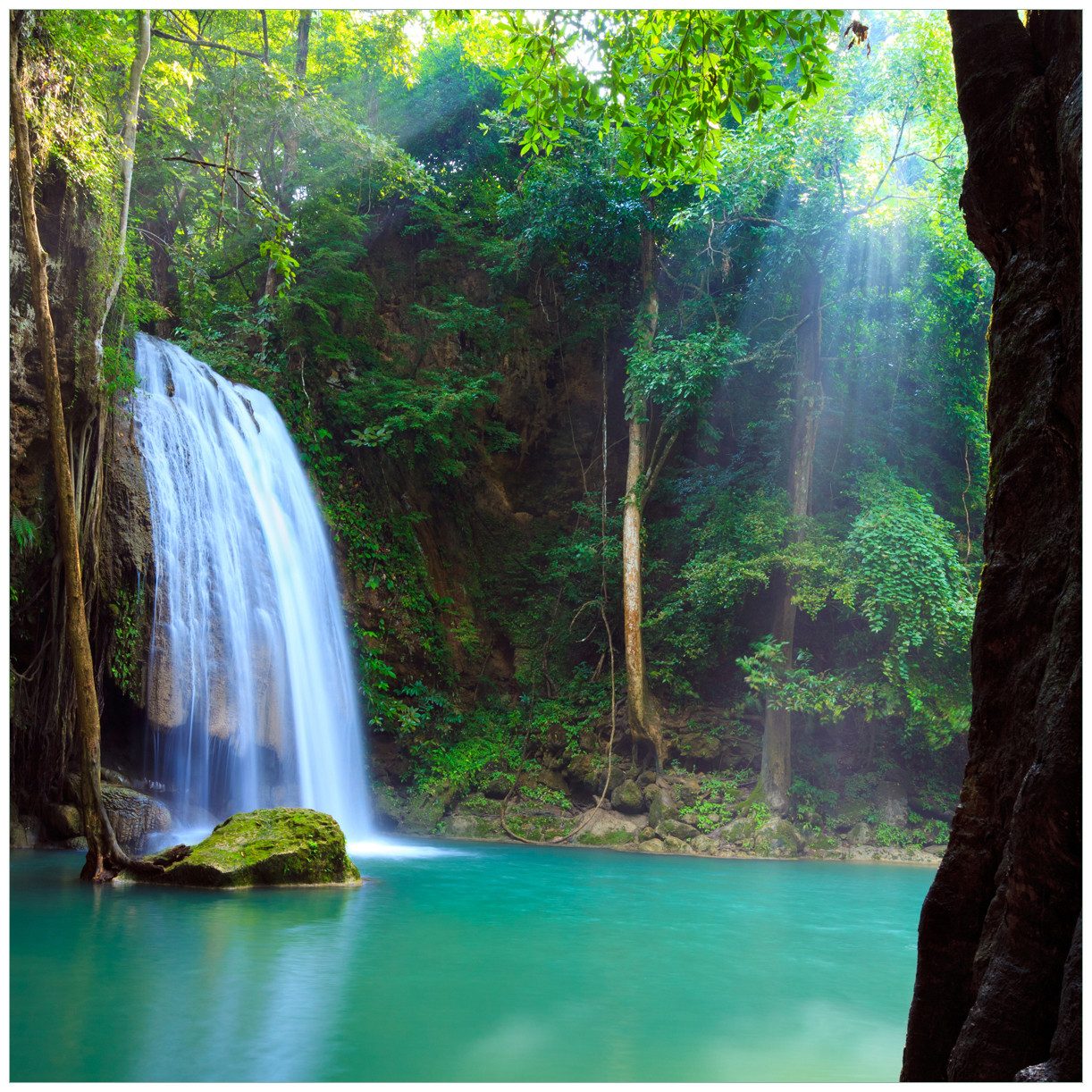 Ein dichter Wald ein Wasserfall mit direktem Anschluss an einen kleinen See neben einem idyllischen Baum. Die Ruhe der Natur in Thailand ist Gold wert. Sanfte Sonnenstrahlen kämpfen sich den Weg durch die Baumkronen auf den Wasserfall.