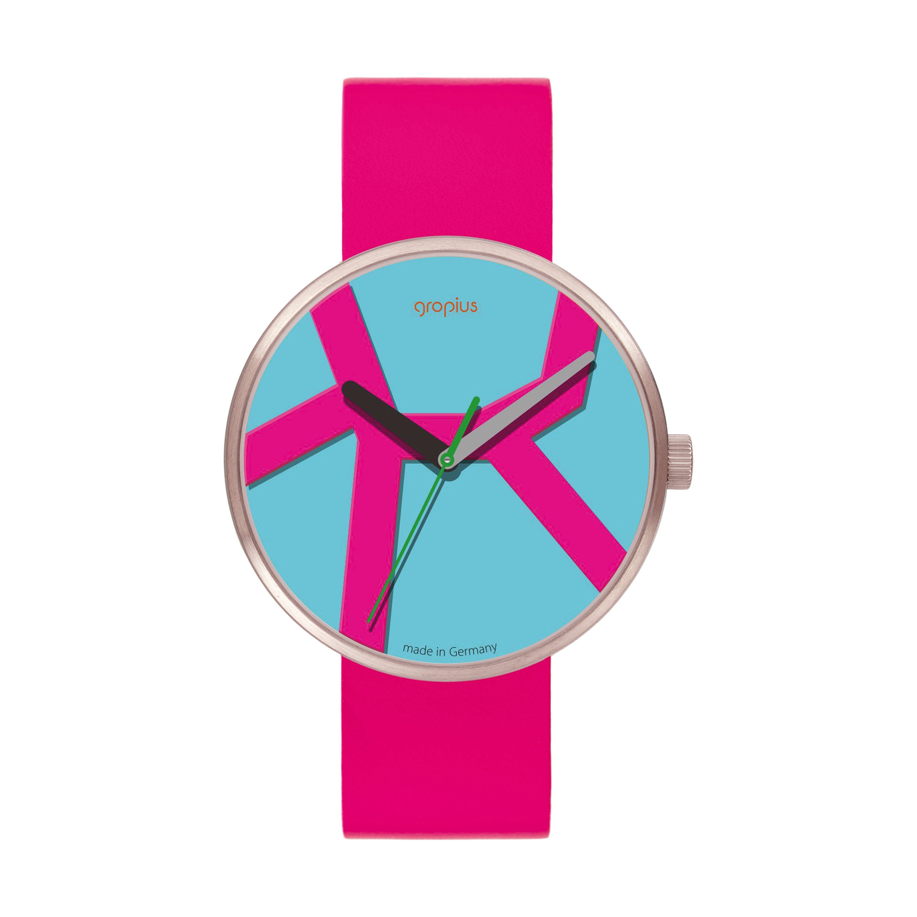 Die Uhren, die im Geiste des Bauhauses entworfen werden, verkörpern dessen Essenz mit ihrem klaren Design und hoher Funktionalität. Diese Zeitmesser sind mehr als bloße Gebrauchsgegenstände; sie sind stilvolle Accessoires, die das Erbe von Gropius und seine Philosophie fortführen. Sie vereinen Ästhetik und Funktionalität in einer Weise, die sowohl Liebhaber des klassischen Bauhaus-Stils als auch moderne Uhrenfreunde anspricht. Das Design der Uhren ahmt nicht den Gestaltungsstil von Gropius nach, sondern interpretiert ihn neu. Bauhaus steht allgemein für zeitloses Design, Einfachheit, vor allem aber auch für das Experimentelle. Das Design der Bauhaus Walter Gropius Uhren macht den neugierigen und spielerischen Aspekt am Bauhaus sichtbar. Poppige Farben, basierend auf den Grundfarben Blau, Gelb und Rot, farbige Zeiger sowie grafische Zifferblätter sind charakteristisch für die Uhrenkollektion.