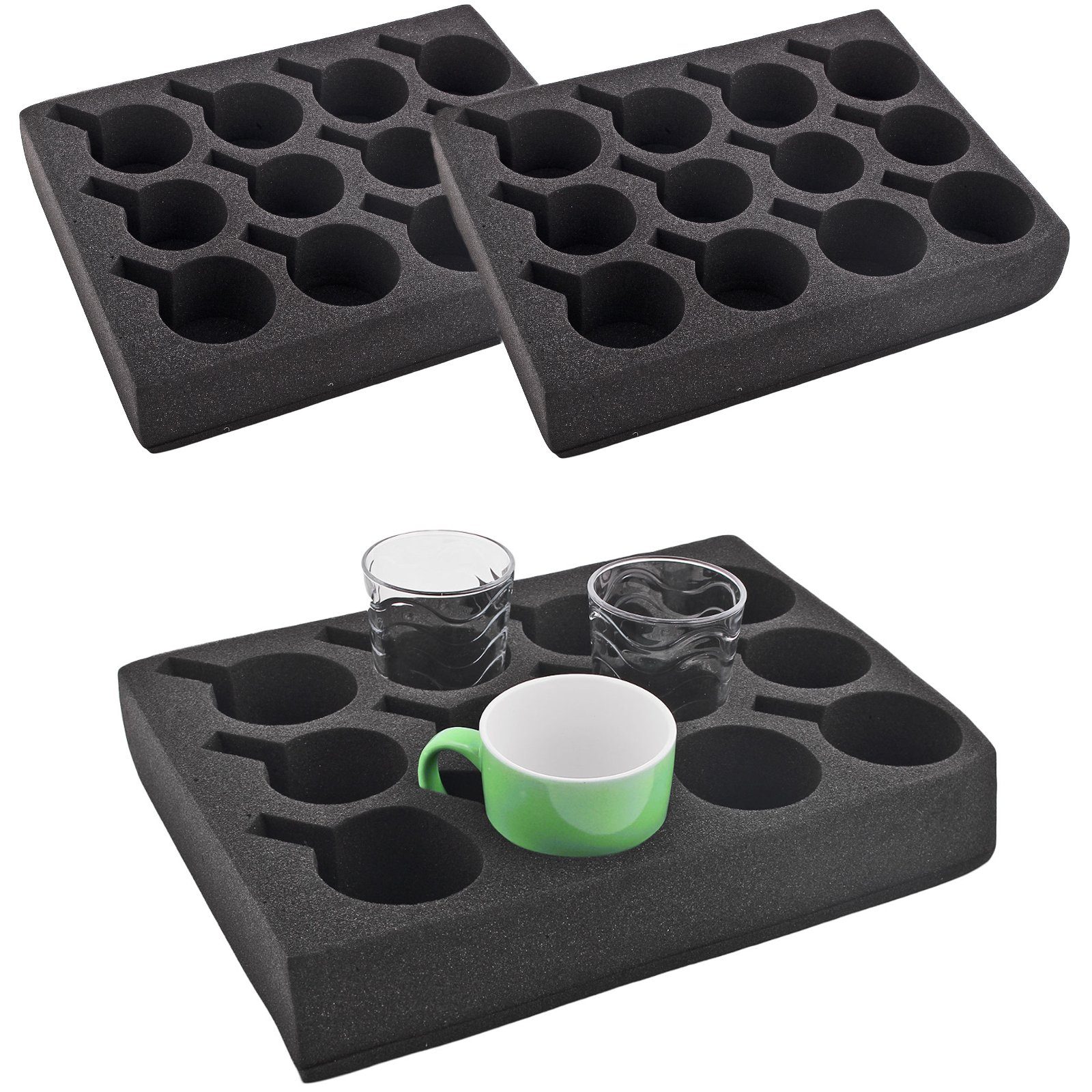 Weich gebettet ermöglicht es dieser praktische Alltagshelfer, deine Tassen, Gläser und Becher sicher im Wohnwagen oder Wohnmobil zu verstauen. Gut sortiert stehen diese auch auf abenteuerlich-wackeligen Pisten fest und bruchsicher. Der Halterungsblock ist aus einem speziellen, formstabilen Schaumstoff gefertigt, der trotzdem noch Spielraum für Bewegung von außen lässt und somit weder durch Überspannung der Gefäße, noch durch zu lockeren Sitz zu Scherben führt, auch wenn diese ja bekanntlich Glück bringen.