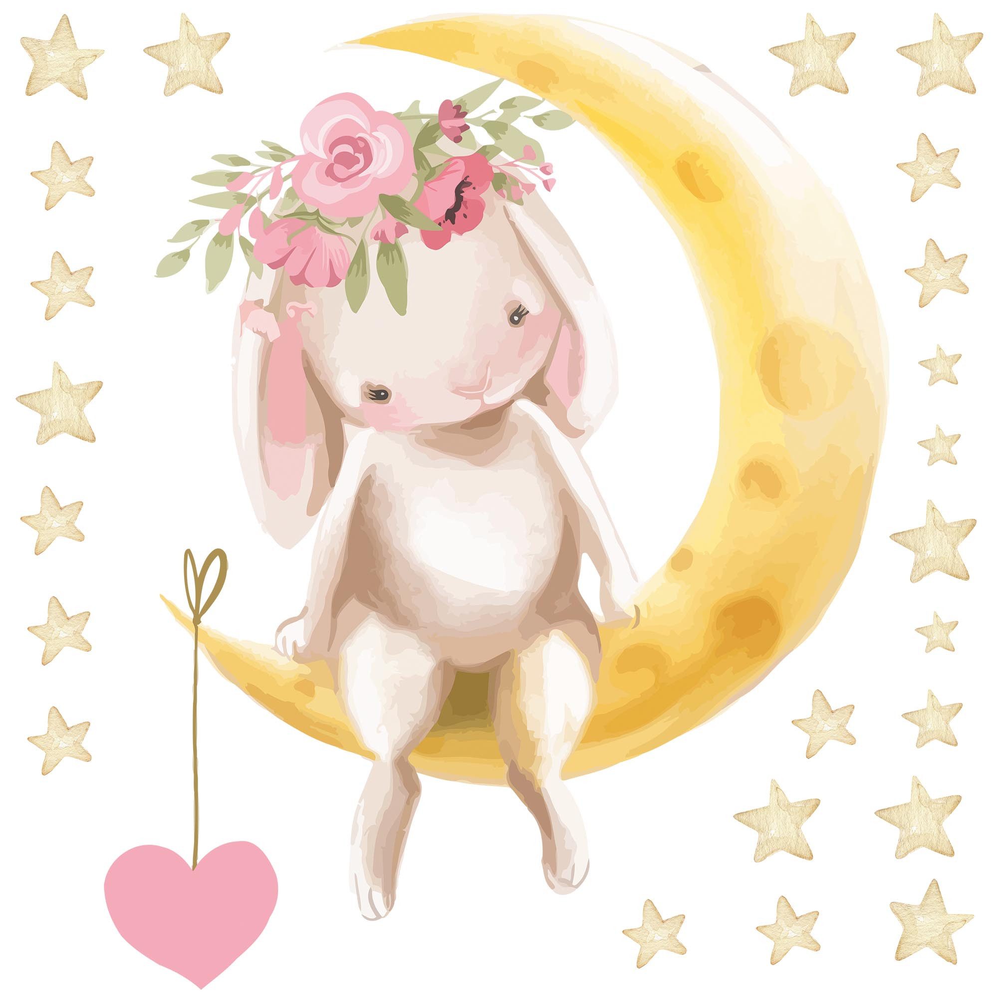 Verzaubere deine Räume mit unserem märchenhaften Wandtattoo-Motiv 'Hase auf einem Halbmond umgeben von Sternen'. Diese hochwertigen Wandtattoos bringen nicht nur Magie an deine Wand, sondern sind auch kinderleicht anzubringen und hinterlassen keine Rückstände. Das zauberhafte Motiv zeigt einen niedlichen Hasen auf einem Halbmond, der von funkelnden Sternen umgeben ist – eine Szene voller Poesie und Träumerei. Die sanften Farben und liebevollen Details schaffen eine Atmosphäre der Geborgenheit und des Staunens. Verleihe deinem Zuhause mit diesem Wandtattoo eine Prise Magie und lade ein zu einer Reise in die Sternennacht, wo Träume lebendig werden.