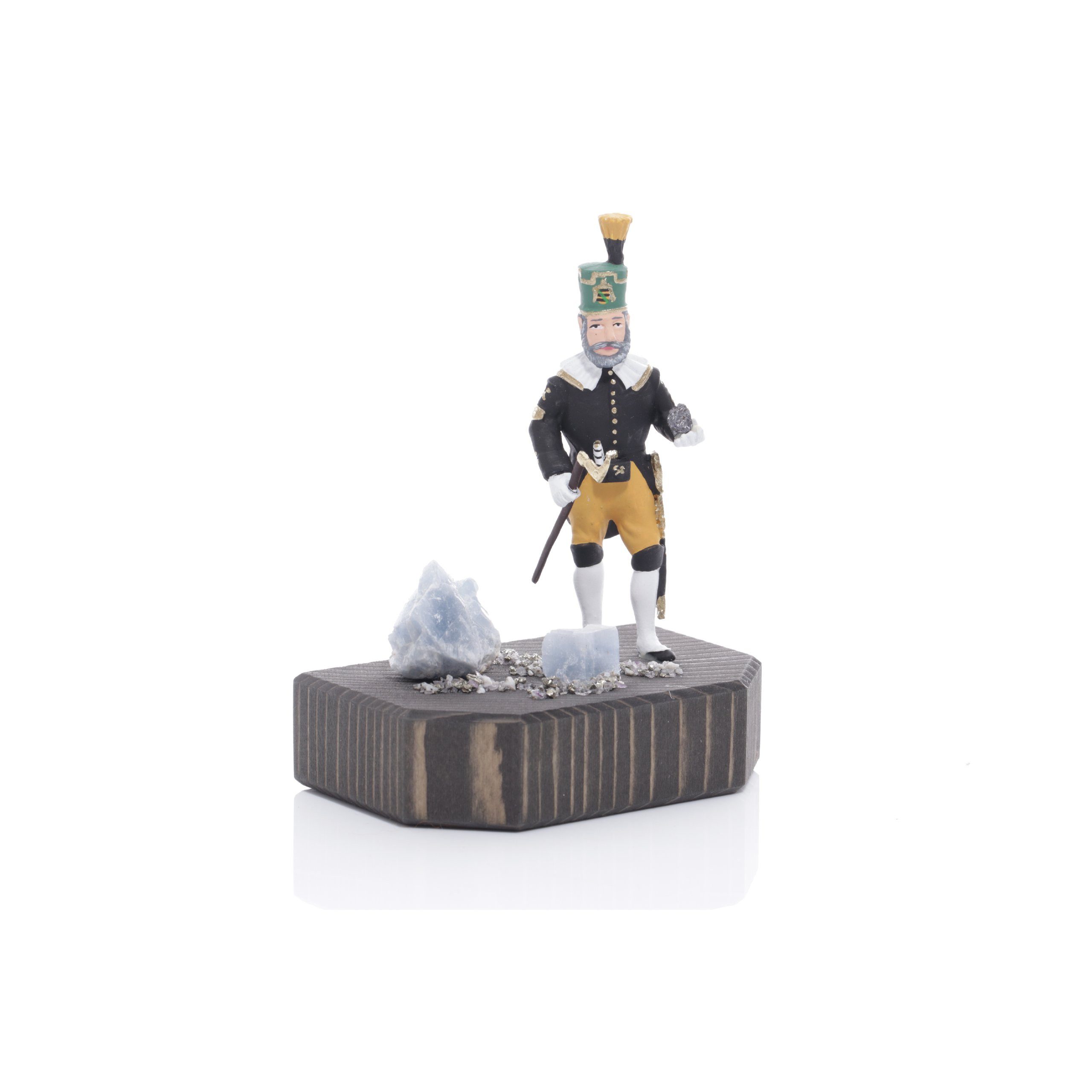 Miniaturbergwerk Sockel Bergmann Schneeberger Obersteiger mit Edelstein bunt Holen Sie sich ein wirklich außergewöhnliches Stück Erzgebirge in Ihre Wohnung. Der Sockel hat eine Розмір von 9,5 cm und wird in verschiedenen Arbeitsschritten komplett in einer Firma mit langer Tradition gefertigt. Auf dem Sockel steht der Schneeberger Obersteiger und daneben liegt ein Edelstein. Die bunte Figur ist aus Zinn gegossen, der Sockel ist aus heimischen Hölzern gefertigt und natur dunkel gestaltet BxHxT 8,5x9,5x6cm NEU |