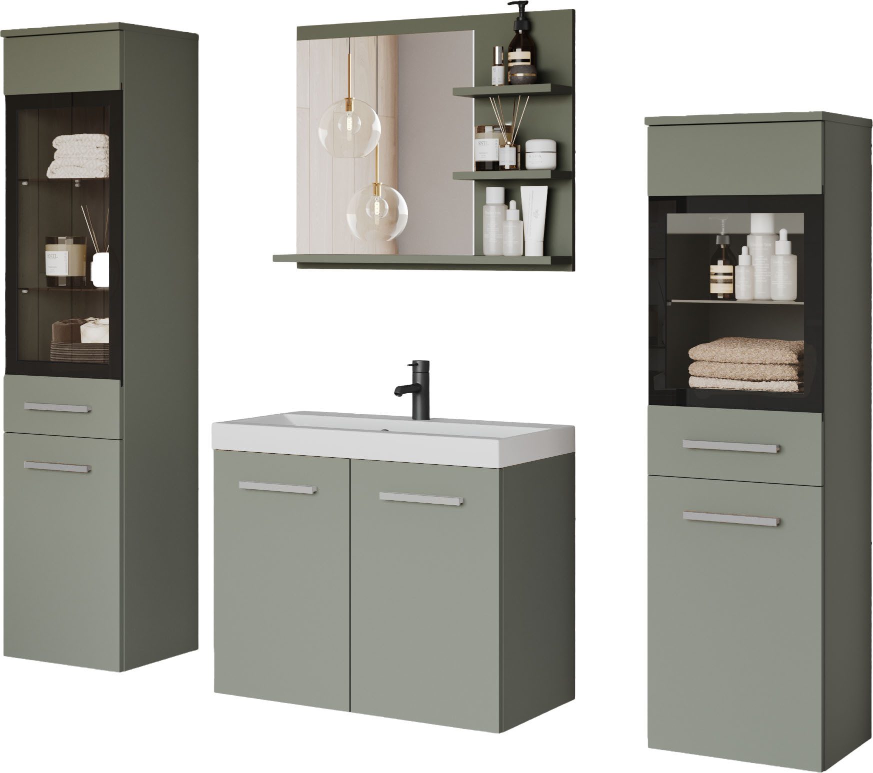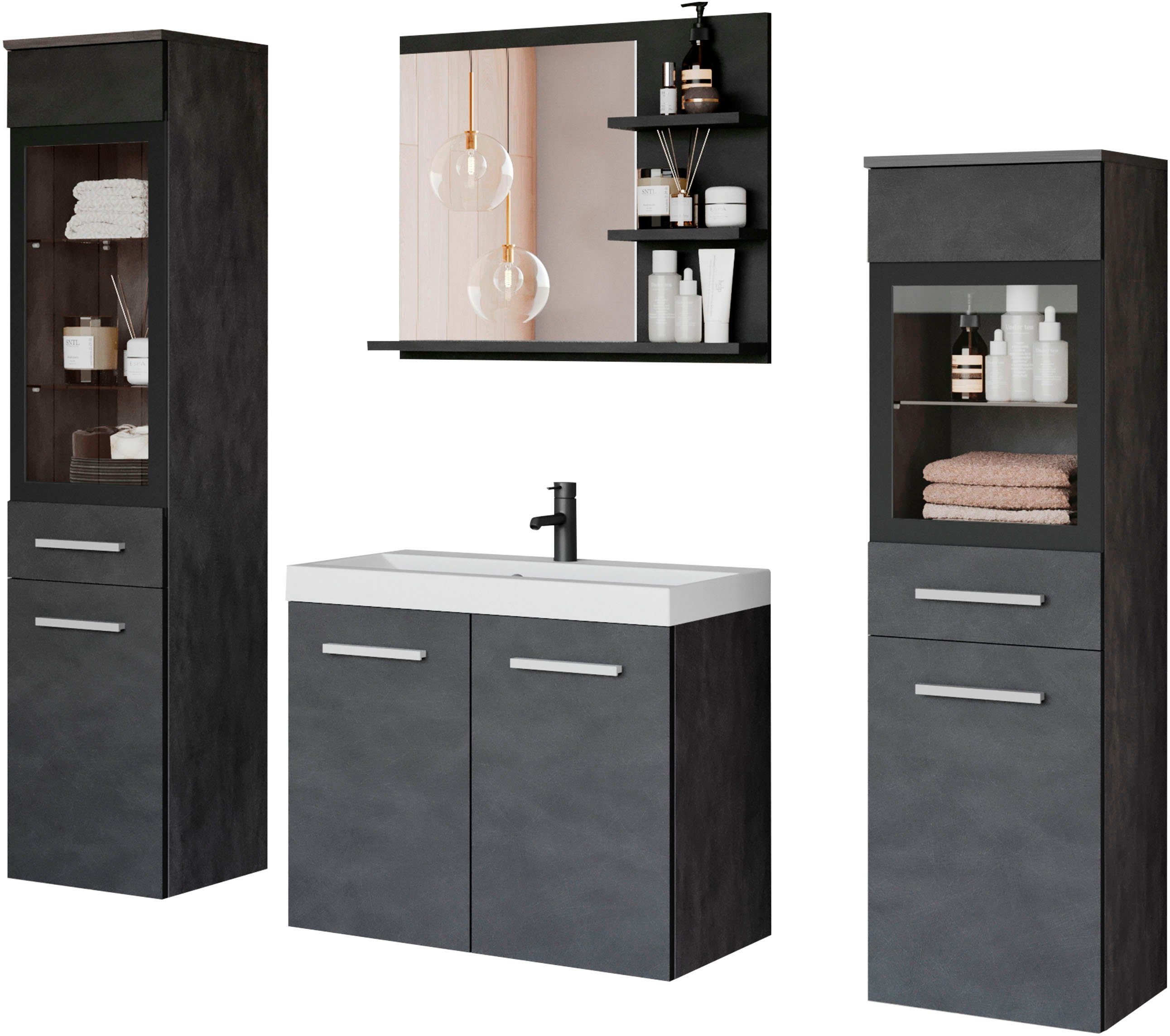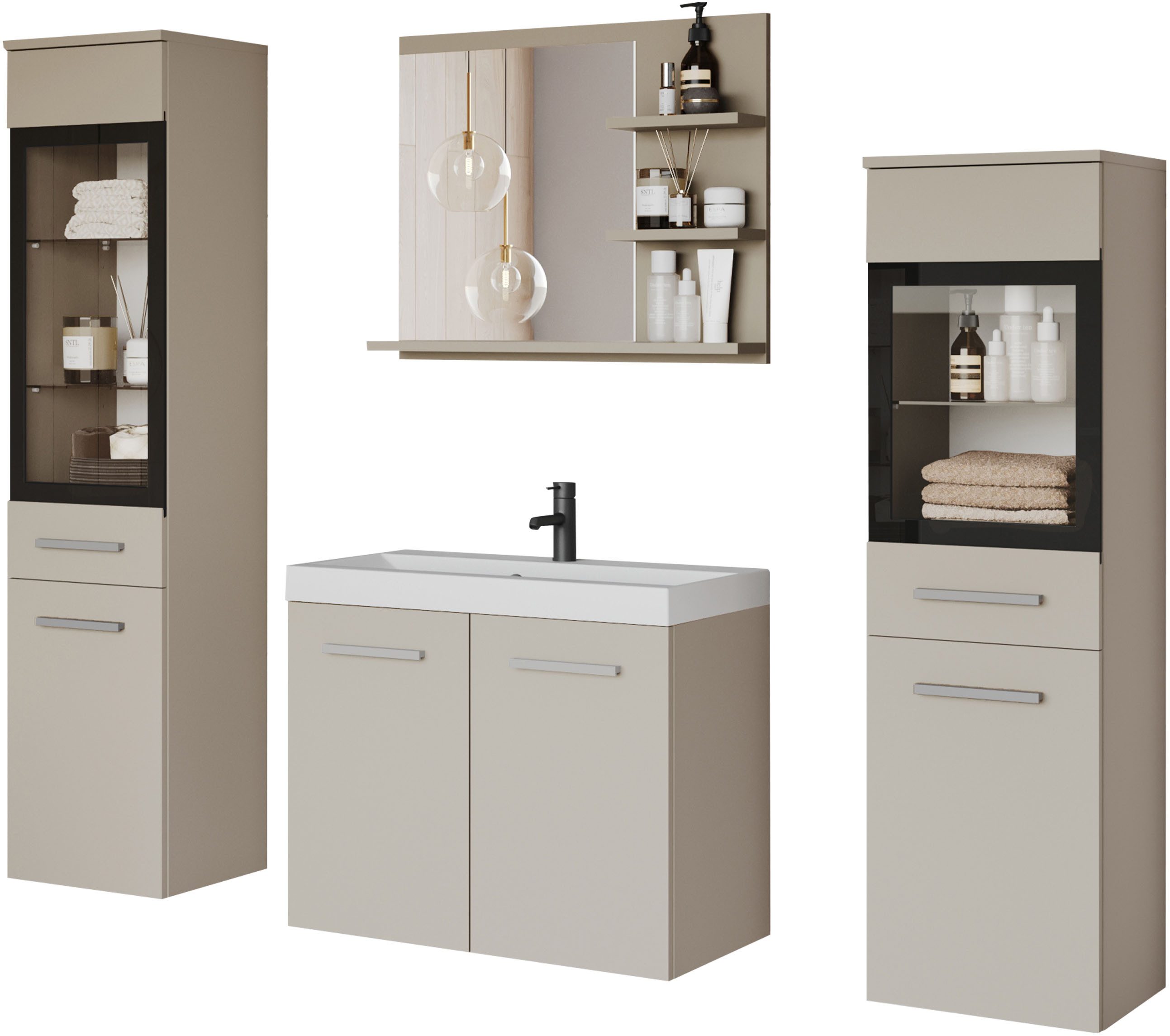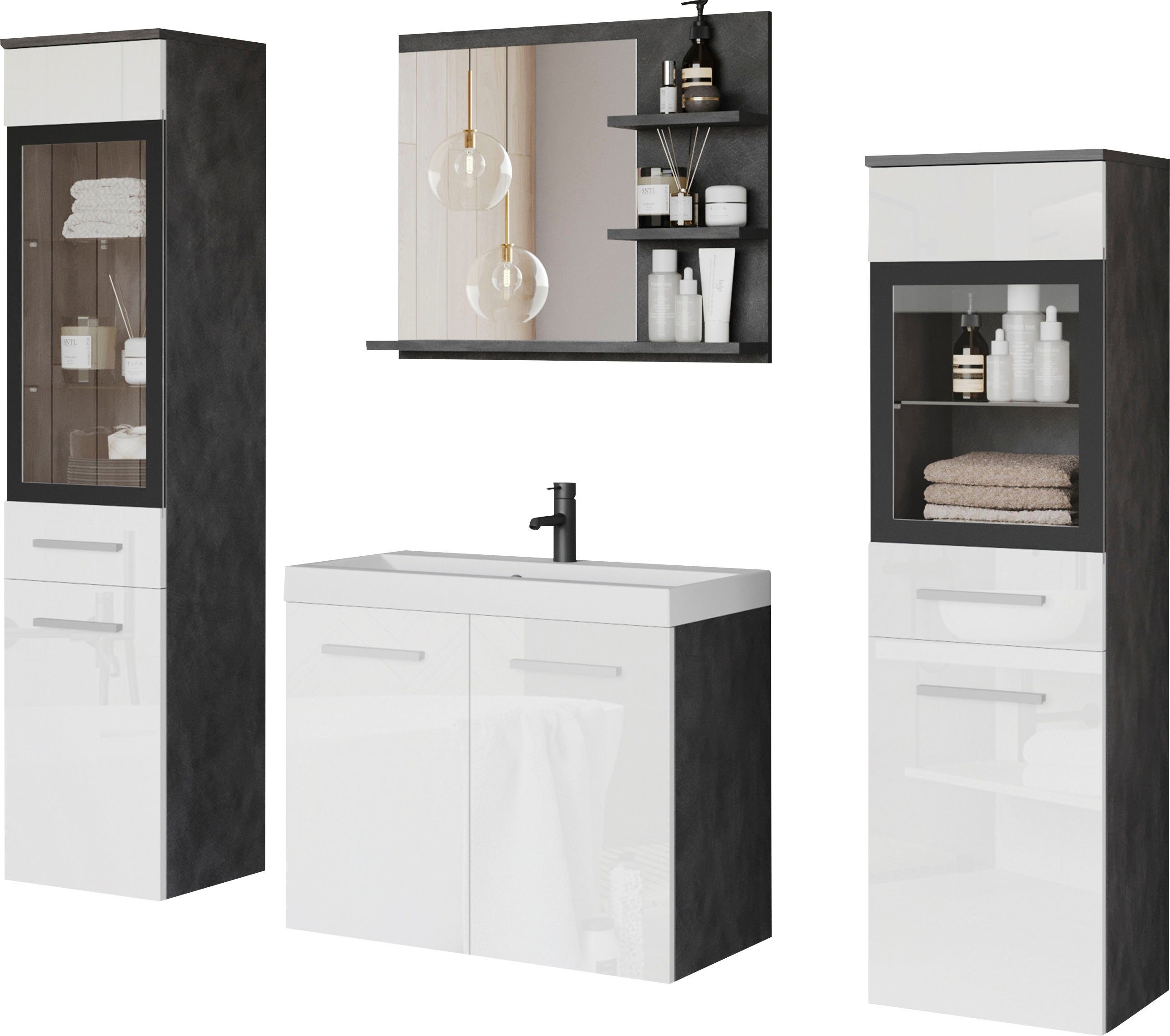 Hinweis Lieferumfang | Achtung: Nicht dabei ist ein POP UP Ablauf mit Überlauffunktion. Lieferung ohne Beleuchtung und Armaturen Möbelfüße sind nicht enthalten Set bestehend aus Badspiegel, Waschbecken mit Überlaufset, Waschbeckenunterschrank, Hochschrank, Hängeschrank inkl. Schritt-für-Schritt-Aufbauanleitung |