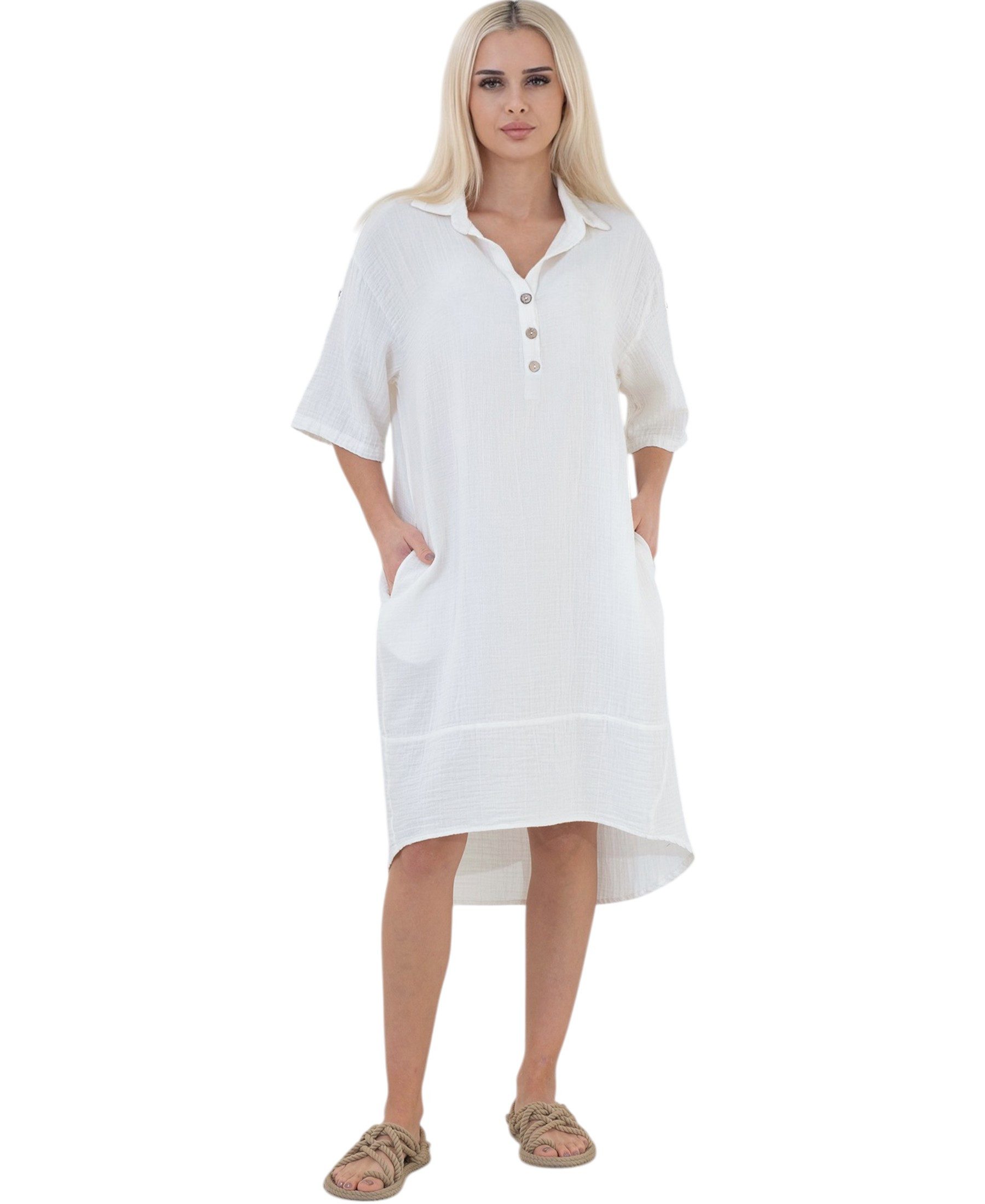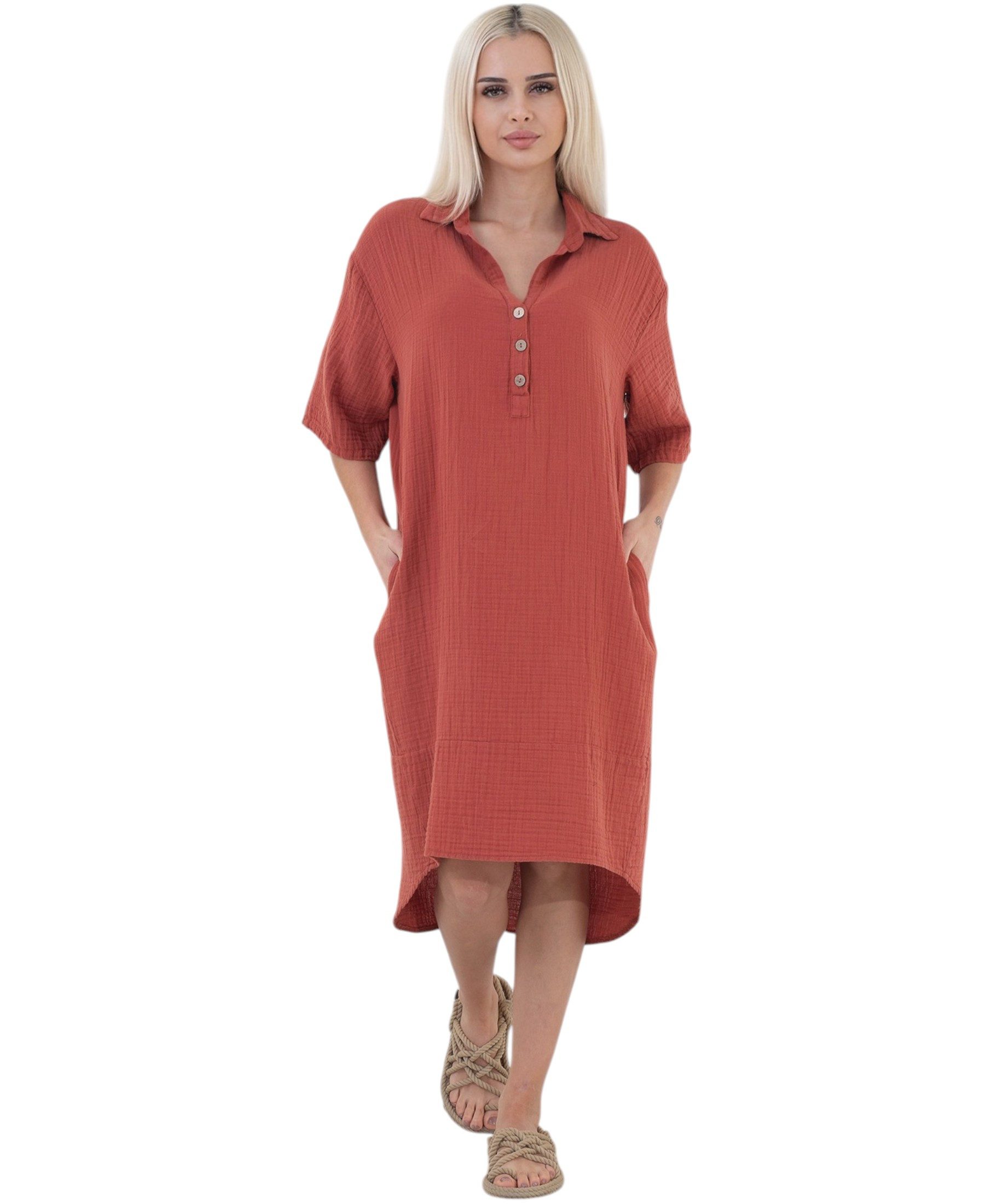 Dieses Tunikakleid aus 100 % Baumwoll-Musselin vereint Stil, Komfort und Еко-товари. Der weiche, atmungsaktive Stoff liegt leicht auf der Haut und ist ideal für warme Tage. Die Rückenpartie ist mit einem Schlitz-Detail versehen, der dem schlichten Design eine modische Note verleiht. Die halblangen Ärmel sind mit Knopf & Riegel zum Krempeln ausgestattet. Die Einheitsgröße passt für Damen von Розмір 34 bis 46, der Schnitt ist locker, verdeckend und bequem. Mit einer Gesamtlänge von 90 cm ist das Kleid sowohl solo als auch mit Hose tragbar. In Ziegelrot, Navy, Weiß, Schwarz und Taupe – perfekt für Freizeit, Alltag und Urlaub.