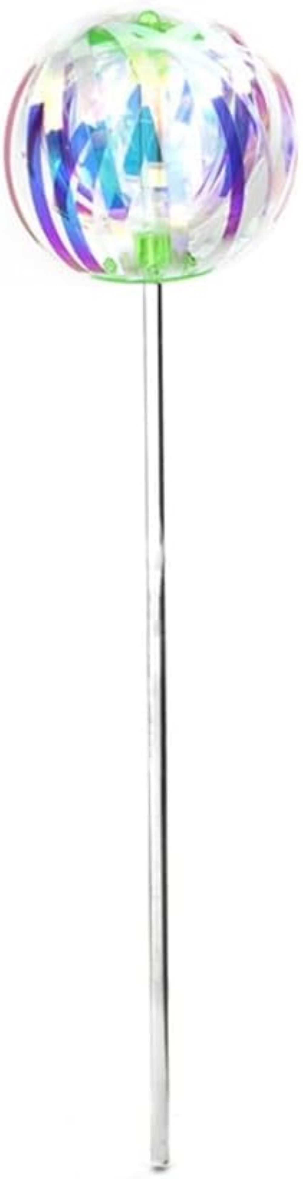 Der Regenbogen-Twirler sieht aus wie eine glänzende, bunte Kugel aus dünnen Plastikstreifen. Diese Streifen hängen an einem Stab und bewegen sich, wenn ihr ihn zwischen euren Händen dreht. Je nachdem, wie schnell ihr dreht und in welchem Winkel ihr haltet, verändert sich die Form und Farbe. Mal sieht er ganz groß und rund aus, mal wird er wieder klein – und immer schimmert er wie eine Seifenblase in Regenbogenfarben.