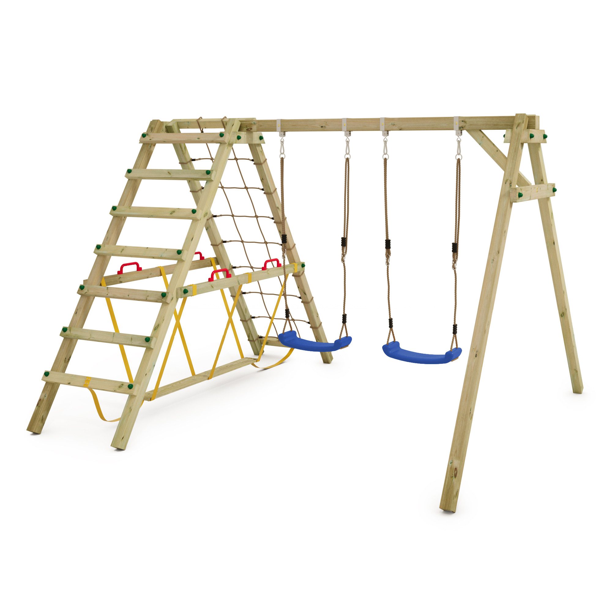 Ausstattung | 2 Schaukelsitze inkl. verstellbarer Seile Kletteranbau Schwebebalken Sicherheitshandgriffe Sicherheitskappen |