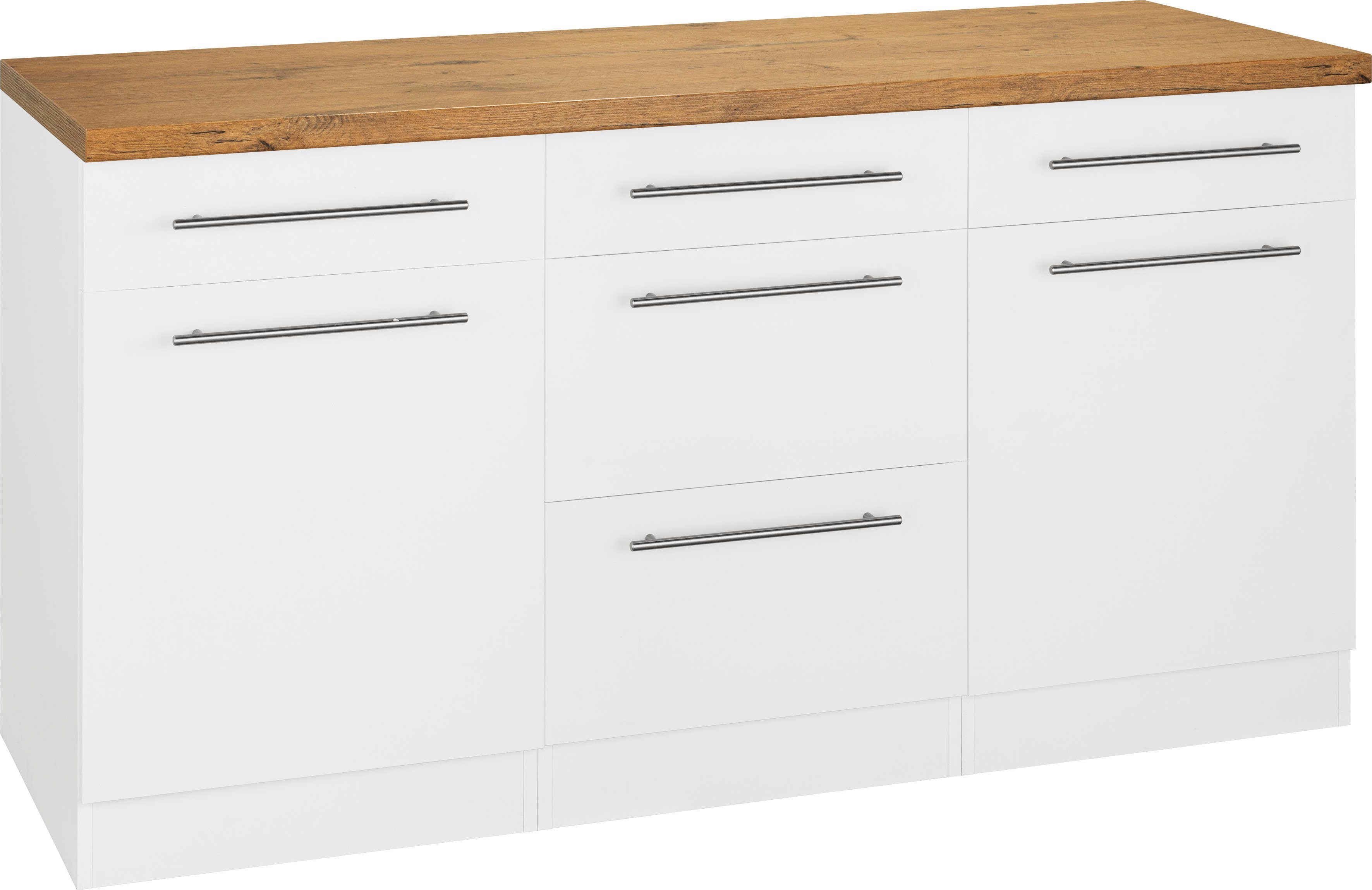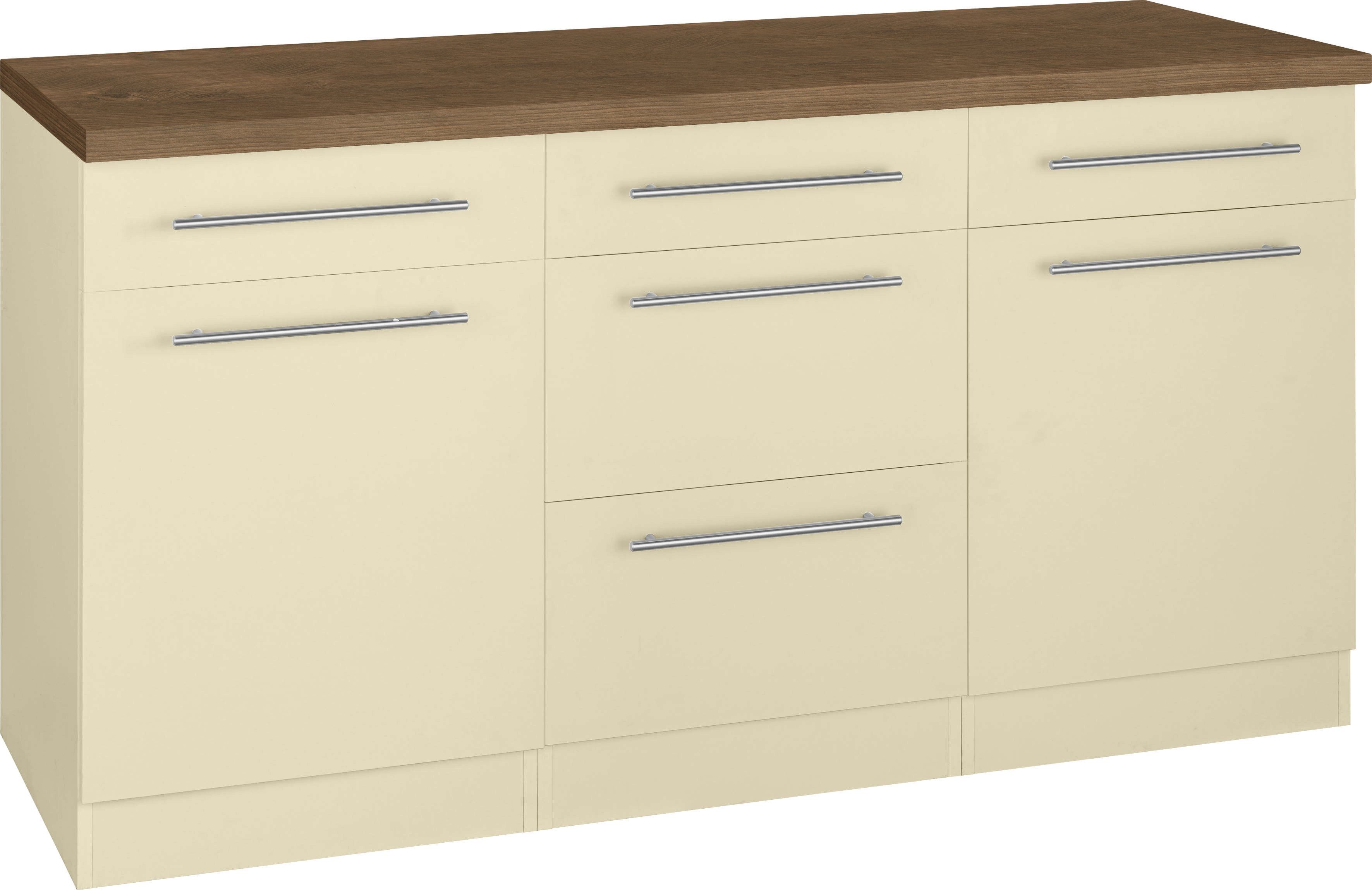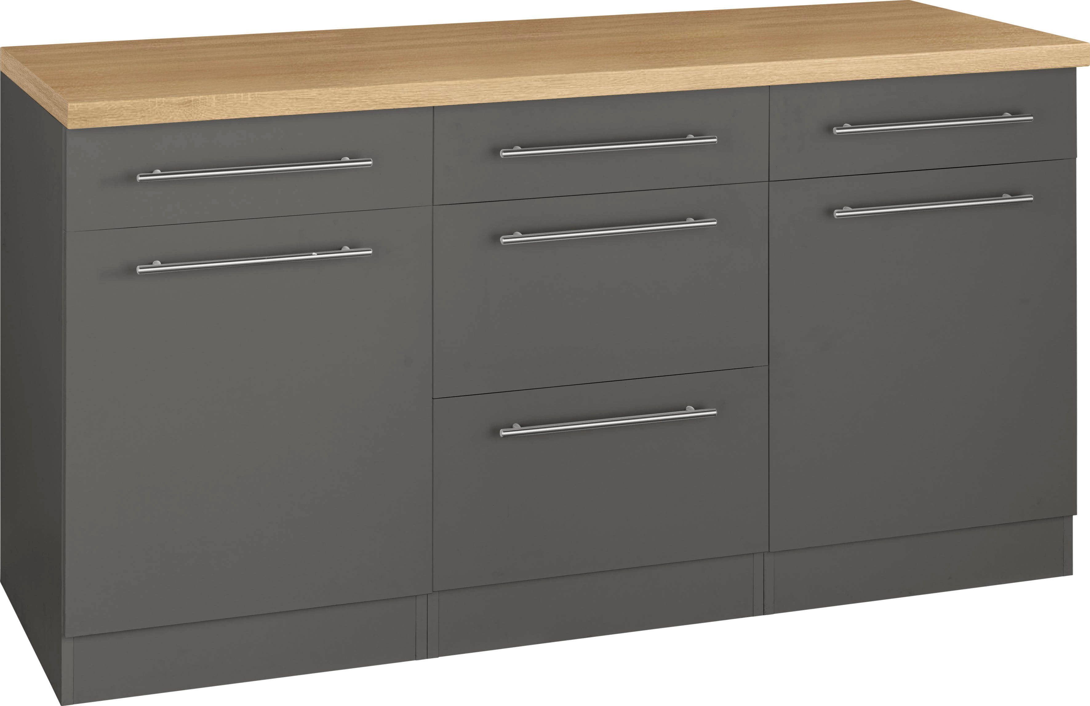 Wissenswertes | 1 Unterschrank mit 1 Schukasten und 2 Auszügen (B/T/H): 50/57/82 cm 1 druchgehende Arbeitsplatte (B/T/H): 150/60/38 mm 2 Unterschränke (B/T/H): 50/57/82 cm Bestehend aus 3 Unterschränken Schränke links oder rechts stellbar |