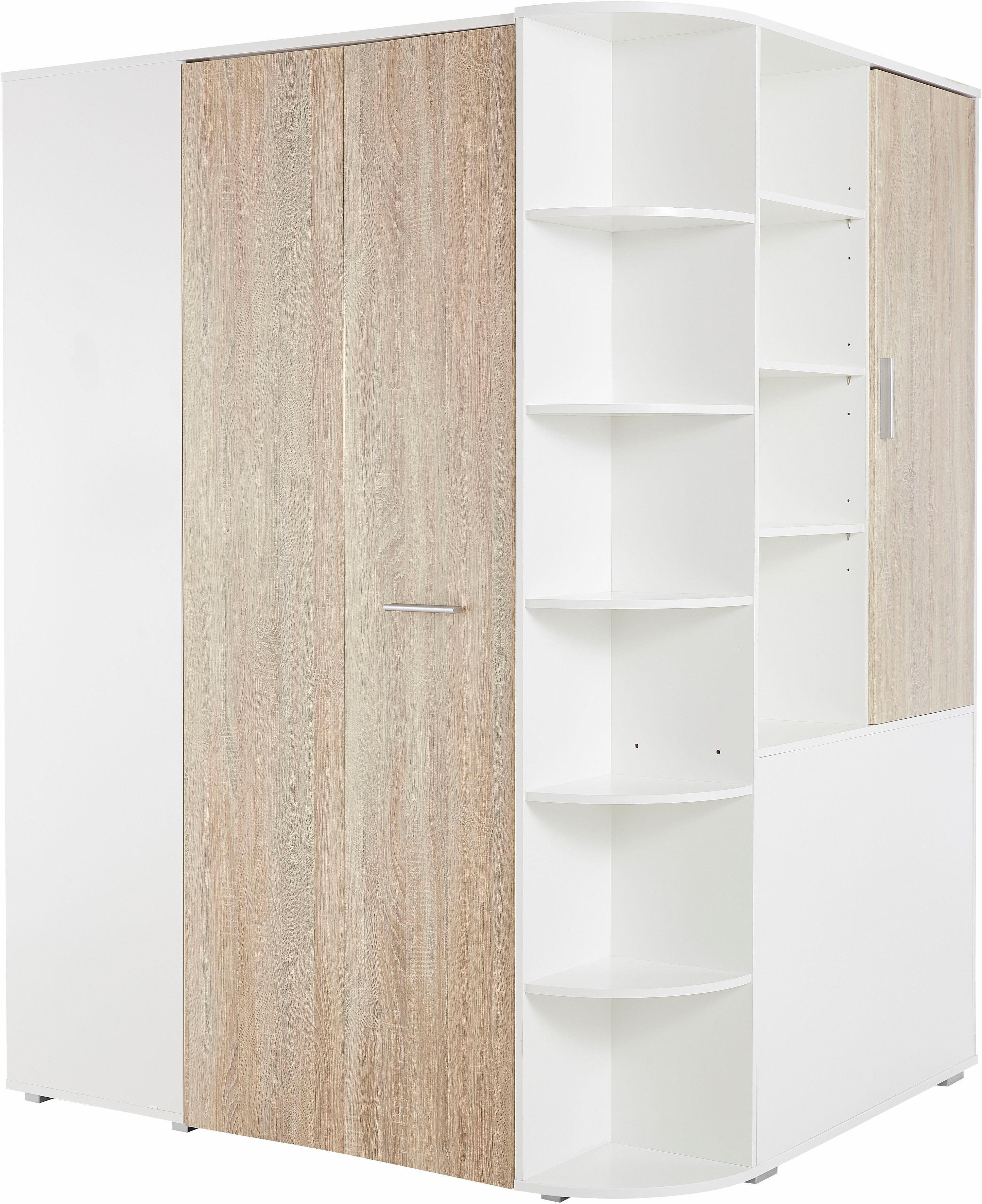 Wissenswertes | Außen: Eckregal mit abgerundeten Ecken und 3 offenen Fächern Regalschrank mit 1 Tür, dahinter 2 Einlegeböden, und 4 offenen Fächern Innen: 2 große Einlegeböden 4 kleine Einlegeböden 1 Kleiderstange 3 Kleiderhaken Inneneinteilung siehe Piktogramm |