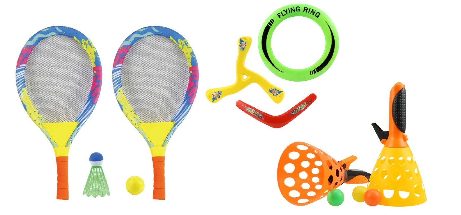 Lieferumfang | Ballspiel mit 2 Netz-Schlägern, 1 gelber Softball und 1 großer Federball 1 Fangballspiel "click and catch" mit 2 Fangkörben und 3 Bällen Flying Disc Pack mit 1 Flugring, 1 klassischem Bumerang, 1 Triple Bumerang |