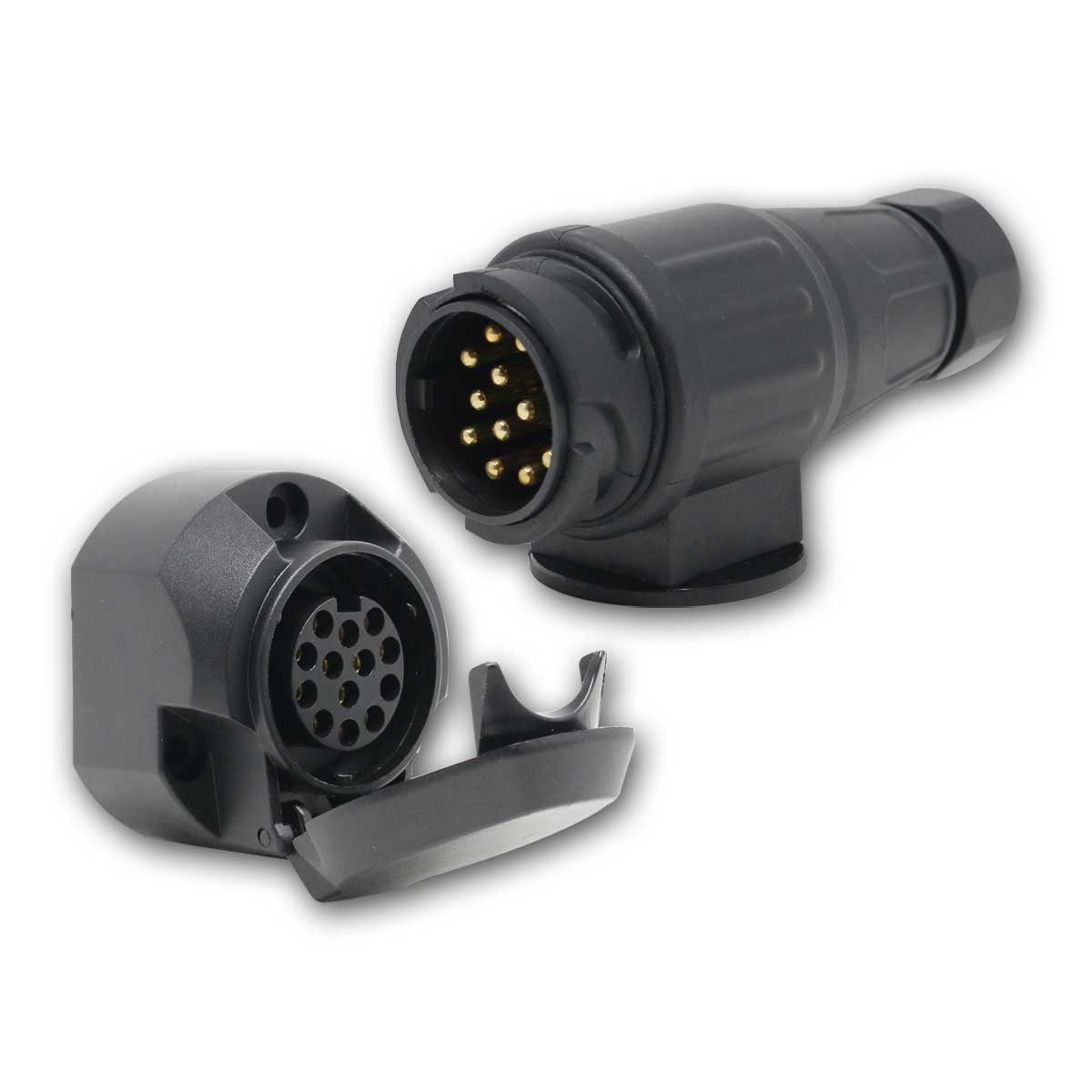 Lieferumfang: - 1x Kfz Anhänger Stecker, 13-polig, lange Ausführung, 12/ 24V - 1x Kupplung für Kfz-Anhänger Stecker, 13-polig, mit Klappdeckel, Kunststoffgehäuse