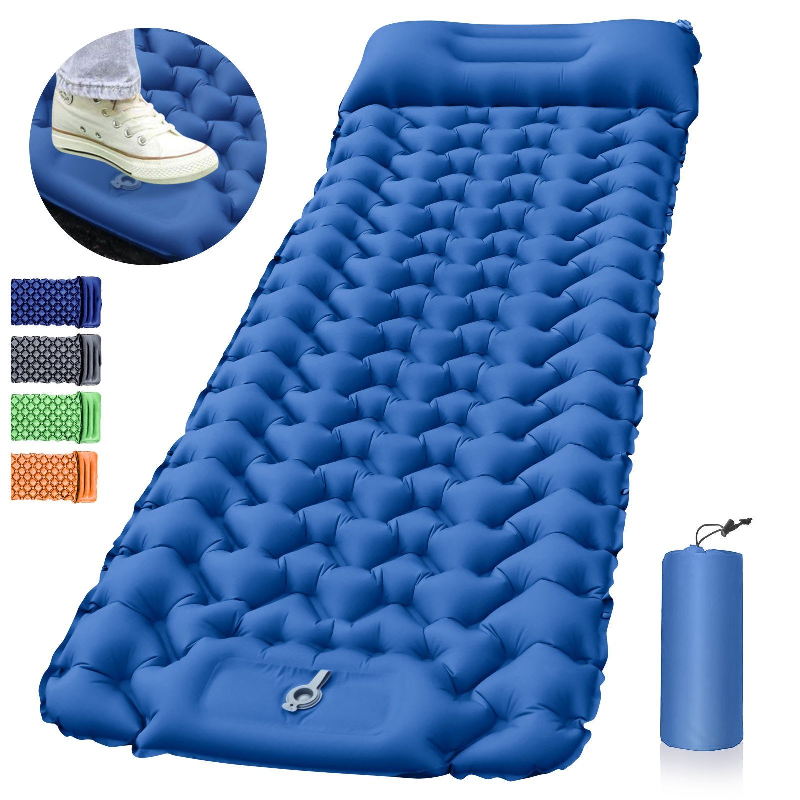 SUPER SCHNELLE FUSSPUMPE - Diese Campingunterlage verfügt über eine eingebaute selbstaufblasbare Fußpumpe, mit der Sie sie in nur 30 Sekunden aufblasen können. Nehmen Sie sich eine Sekunde Zeit zum Ablassen, nachdem Sie die Ablassschraube herausgezogen haben.