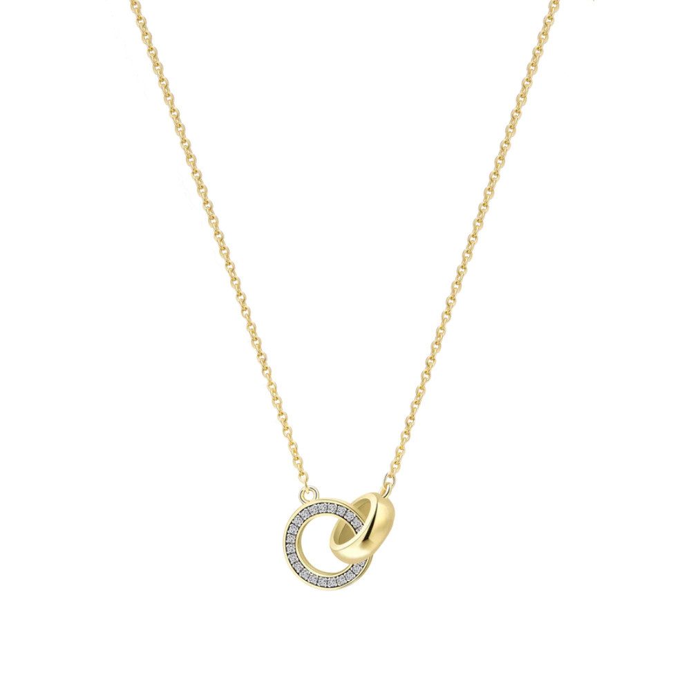Diese Halskette überzeugt mit einem eleganten Symbol der Verbundenheit. Der Anhänger zeigt zwei ineinander verschlungene Kreise, die aus vergoldetem 925er Sterlingsilber gefertigt sind. Funkelnde weiße Zirkonia-Steine verleihen dem Design eine glamouröse Note und setzen glanzvolle Akzente.