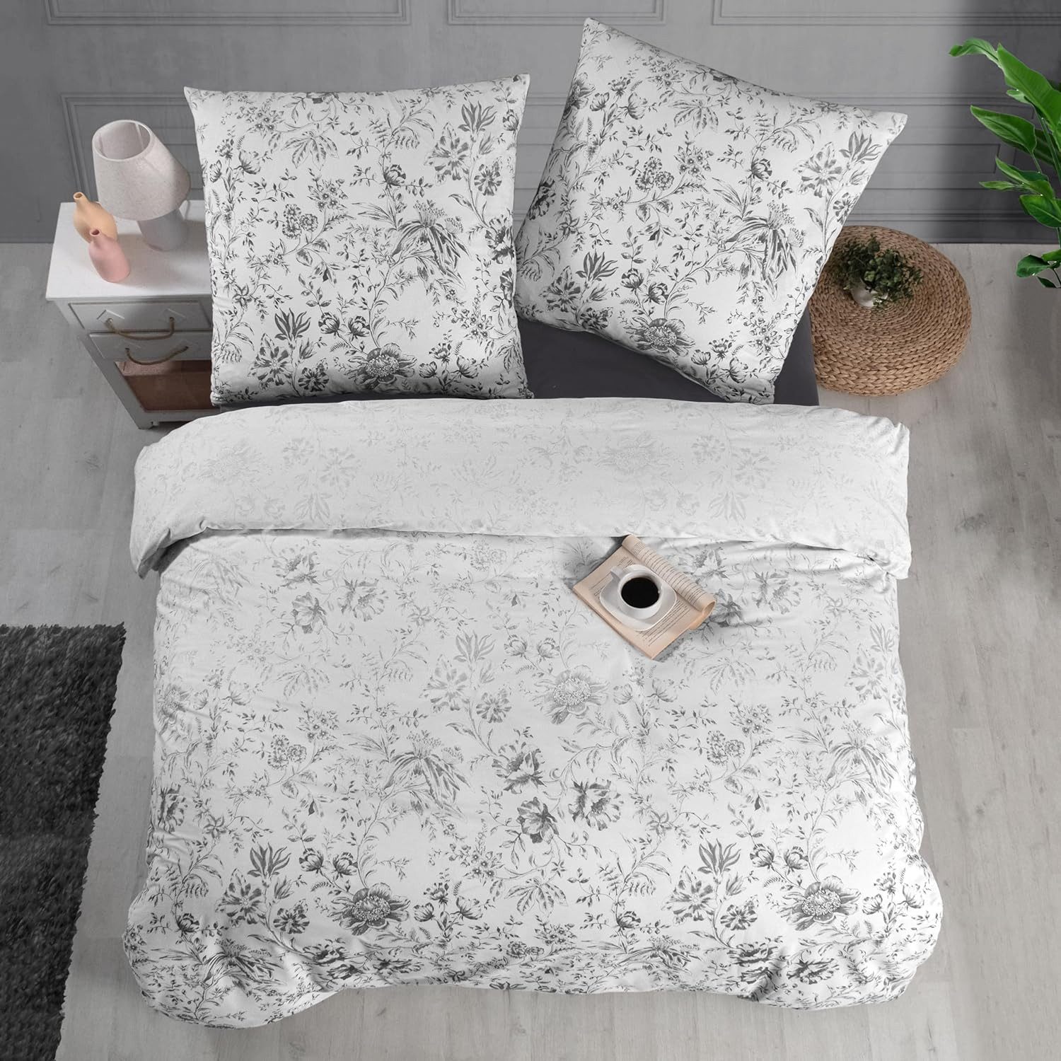 Bettwäsche-Set 200x200 cm 3-teilig – Kuschelig weiche Baumwoll-Bettwäsche in Weiß mit grauem und schwarzem Blumenmuster