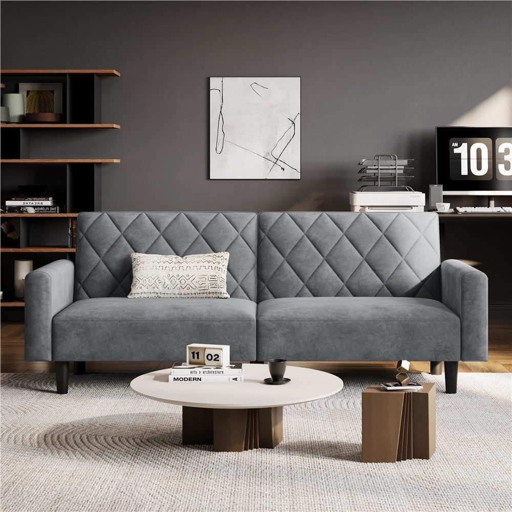Dieses Verwandlungssofa besteht aus dem soliden Rahmen, sechs robusten Beinen und dem strapazierfähigen Bezug aus samtigem Stoff. Sitz- und Rückenflächen sind mit hochdichtem Schaumstoff gepolstert, was sowohl im Sitz- als auch im Liegezustand für Komfort und Unterstützung sorgt. Dieses Möbelstück vereint die Funktionen eines Sofas und einer Liege in einem und ist ideal für kleine Wohnungen oder Zimmer.
