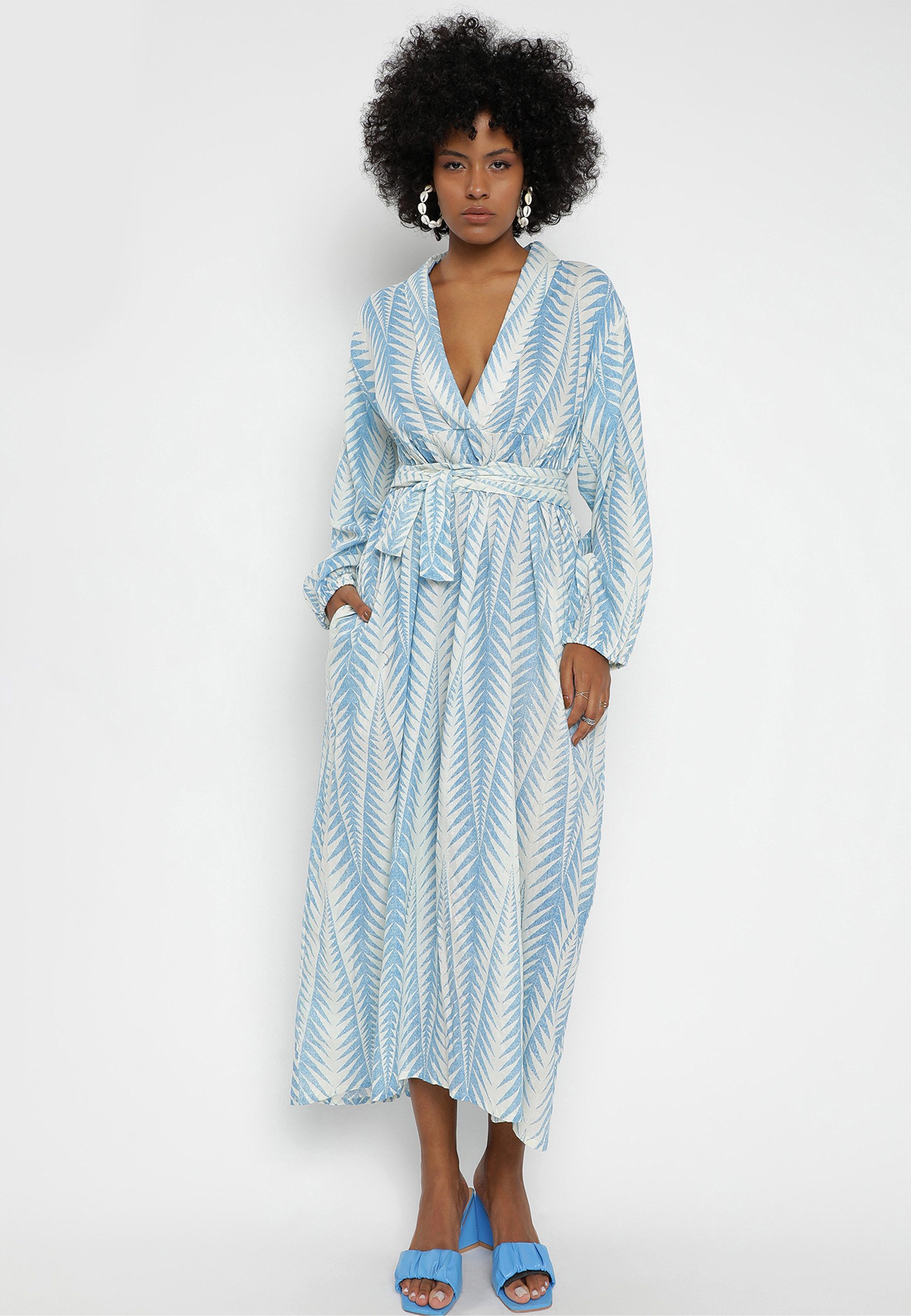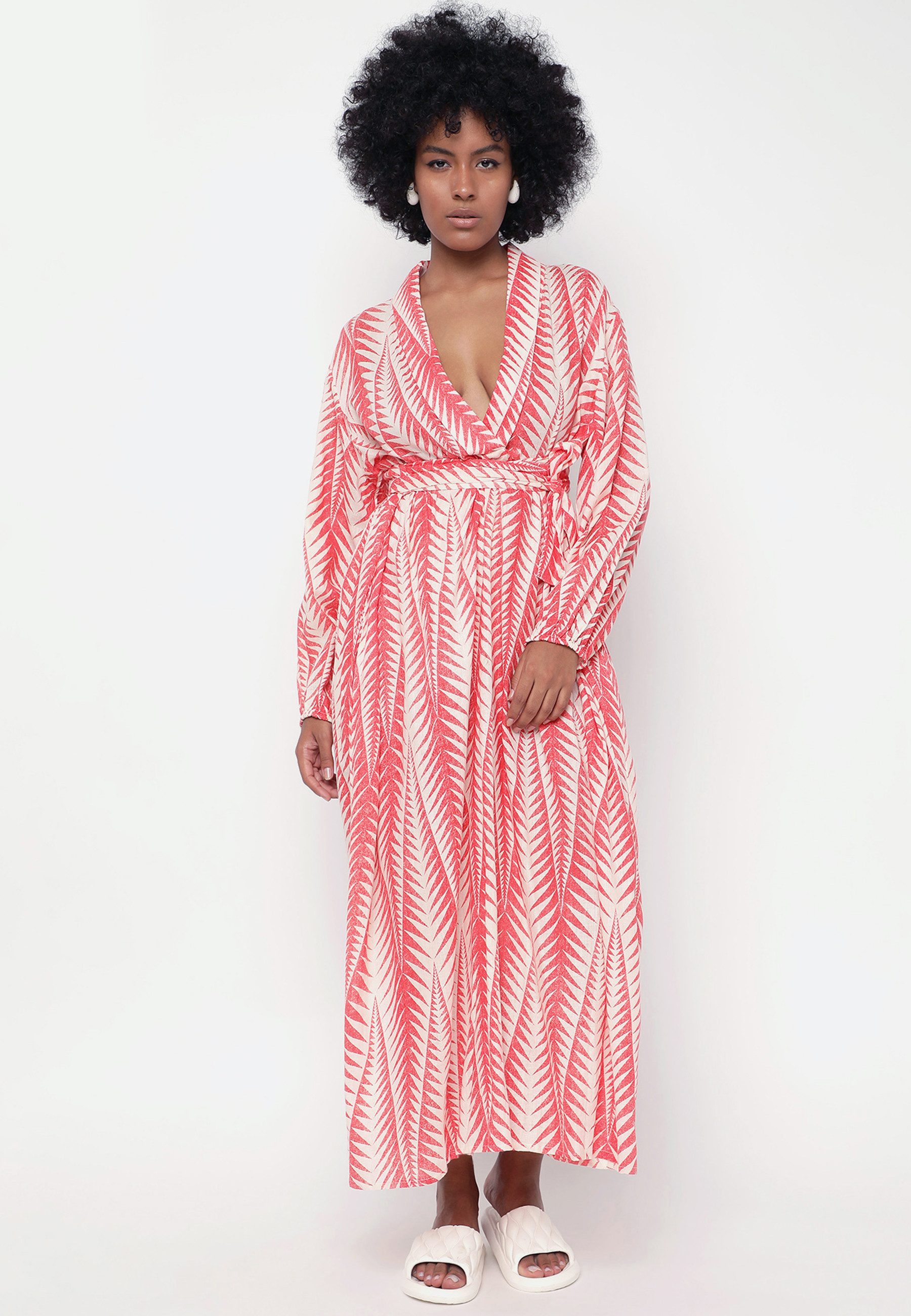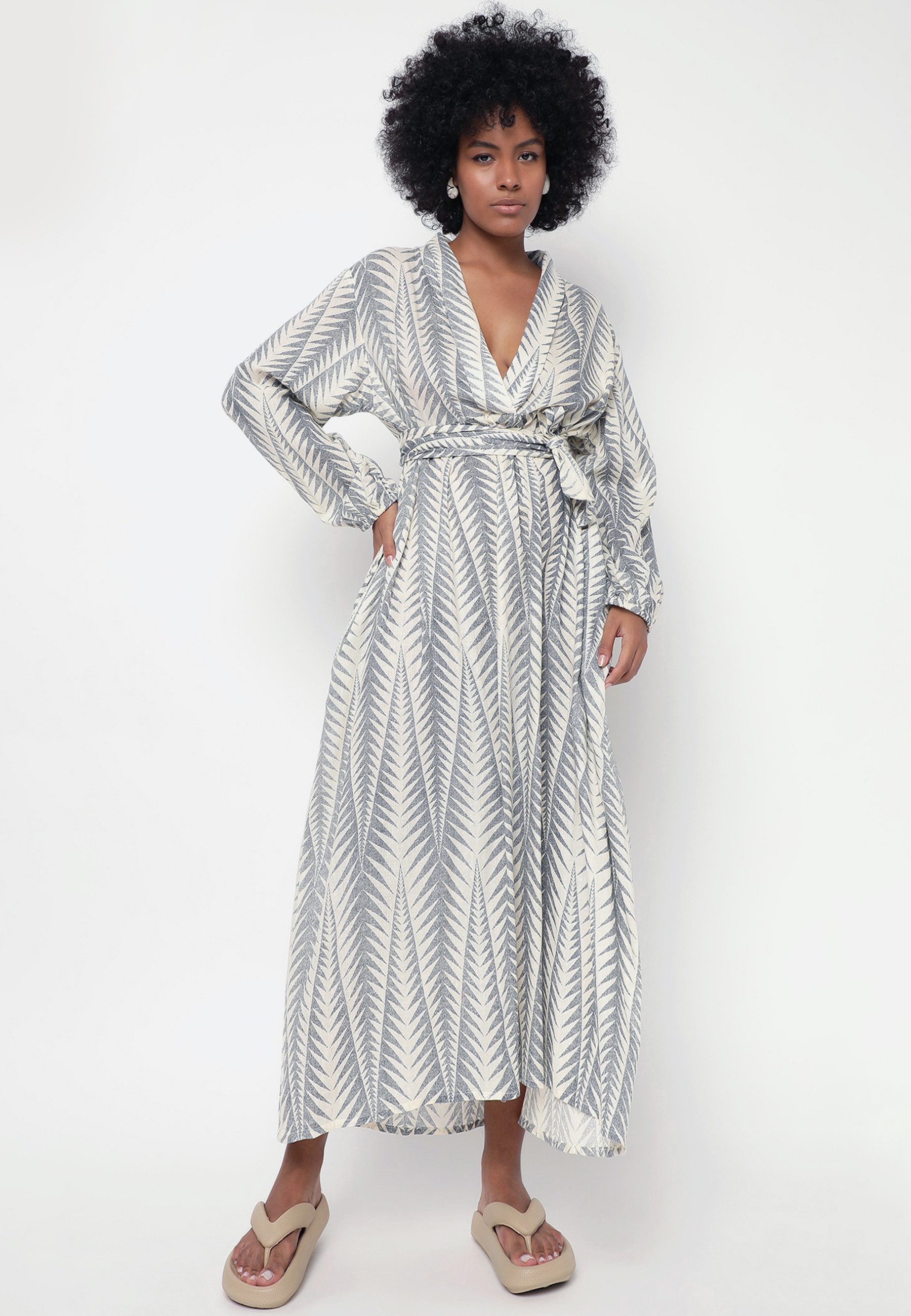 Das Kleid besticht durch sein dezentes, doch markantes Design in sanften Farben, mit einem feinen, blattartigen Muster, das eine ruhige und doch modische Ausstrahlung hat. Der Wickelstil sorgt für eine flexible Passform und betont die Taille auf schmeichelhafte Weise. Die langen, weiten Ärmel und der lockere Schnitt sorgen für ein komfortables Tragegefühl und eine elegante Silhouette.