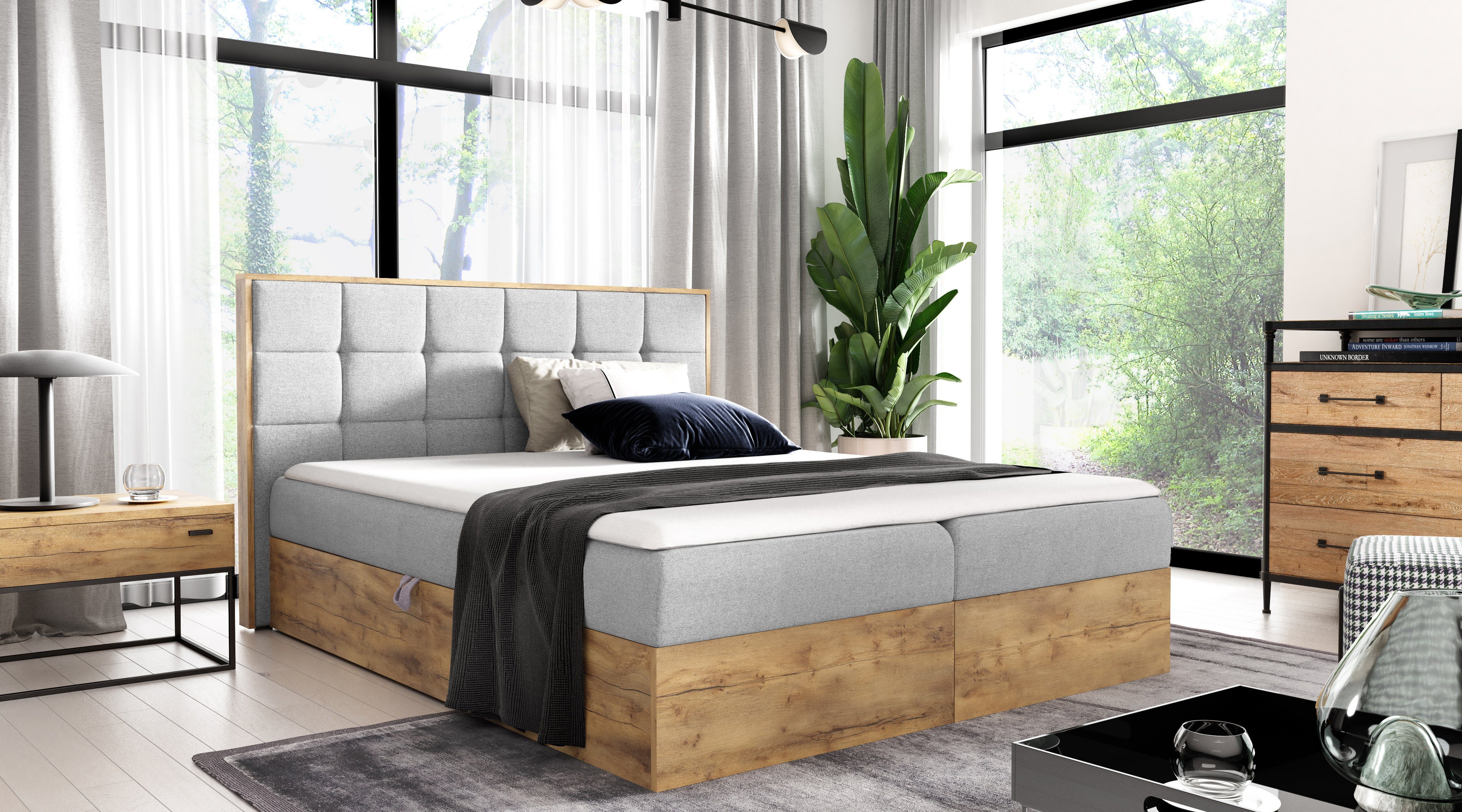 Das Boxspringbett WOOD I überzeugt nicht nur durch seine Funktionalität, sondern auch durch seine Optik. Die massiven Eichen-Elemente geben dem Bett einen stabilen Charakter und unterstreichen die hohe Qualität. Der edle Samtbezug sorgt für eine luxuriöse Ausstrahlung, die in modernen wie klassischen Schlafzimmern ein stilvolles Highlight setzt. Die Kombination aus Holzoptik und samtiger Polsterung macht dieses Modell besonders einzigartig und vielseitig einsetzbar.